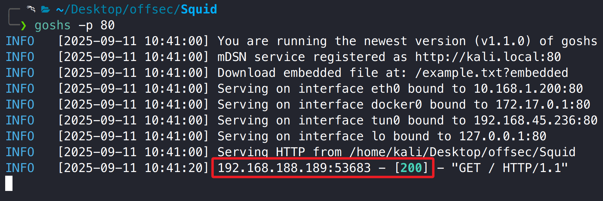 在 kali 开启 web 共享,然后在浏览器使用 squid HTTP 代理访问 kali 共享,成功访问,说明我们的猜想是正确的。