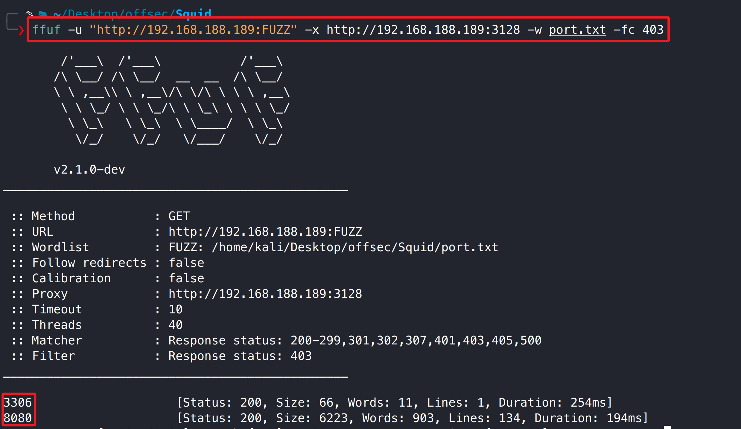 1 ffuf -u "http://192.168.188.189:FUZZ" -x http://192.168.188.189:3128 -w port.txt -fc 403