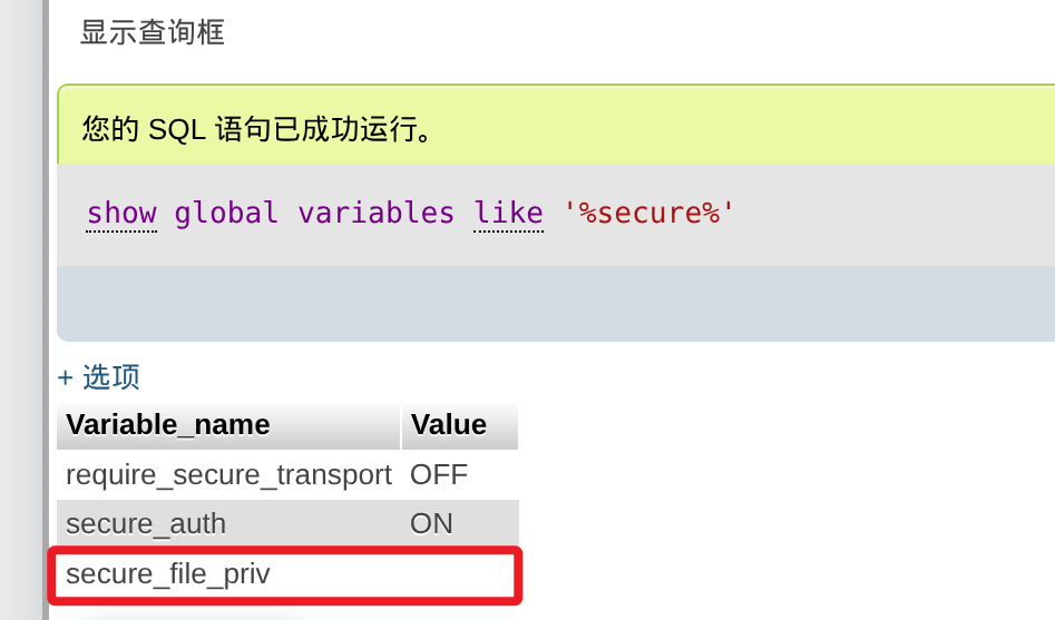 Phpmyadmin 后台可执行 SQL 语句,而且在 phpinfo 中可得知系统网站路径,因此尝试写入 webshell。首先检查 secure_file_priv 值,如果该值没有设置则可进行任意导入导出,如果该值设置了具体目录则只能对该目录进行操作,最后如果该值设置为 NULL 则不允许导入导出。