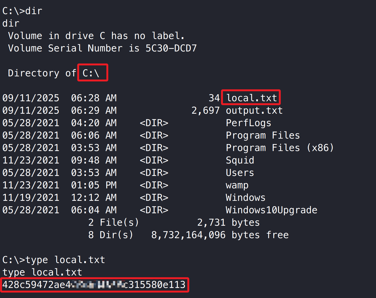 设置 Squid 代理转发 –> 枚举靶机本地端口 –> 得到 3306 和 8080 –> Phpmyadmin 后台空密码 –> 配合 phpinfo 写入 webshell –> 系统 system 权限 –> 用户、管理员旗帜