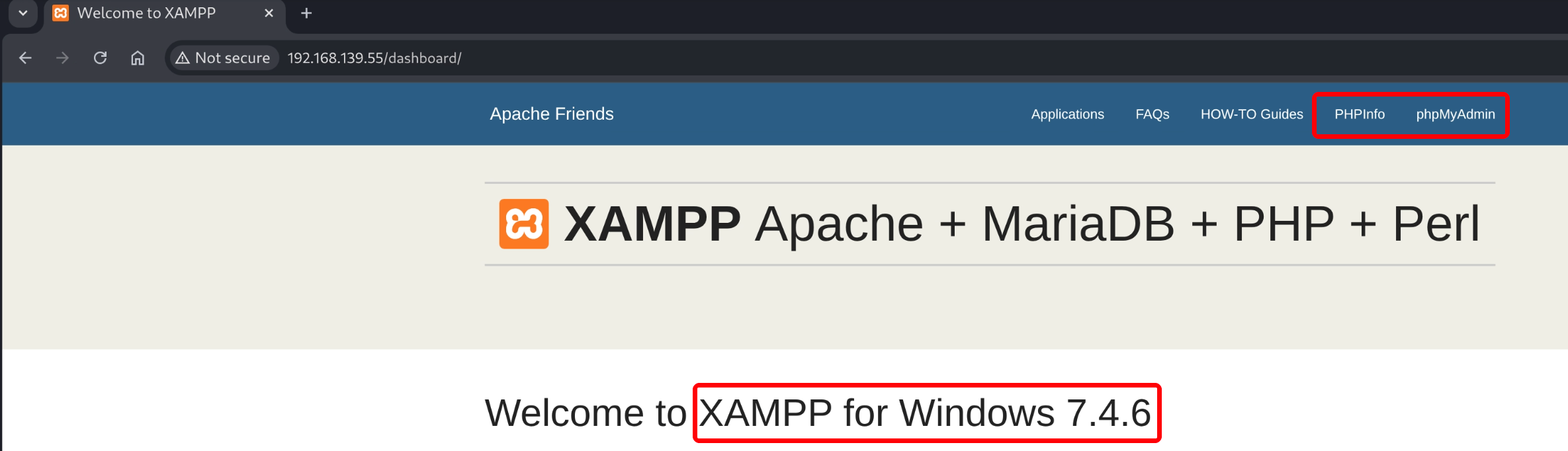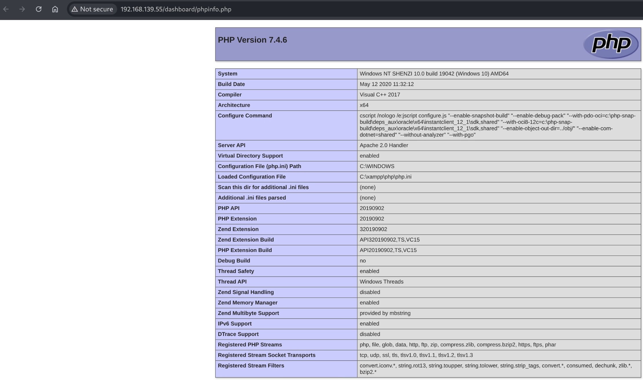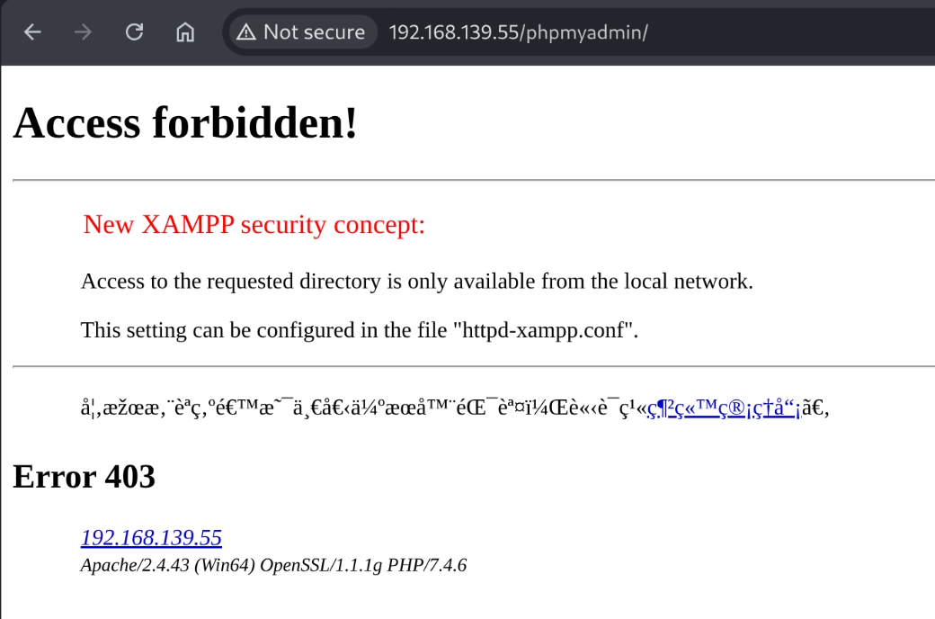 PORT STATE SERVICE VERSION 21/tcp open ftp FileZilla ftpd 0.9.41 beta | ftp-syst: |_ SYST: UNIX emulated by FileZilla 80/tcp open http Apache httpd 2.4.43 ((Win64) OpenSSL/1.1.1g PHP/7.4.6) | http-title: Welcome to XAMPP |_Requested resource was http://192.168.115.55/dashboard/ |_http-server-header: Apache/2.4.43 (Win64) OpenSSL/1.1.1g PHP/7.4.6 135/tcp open msrpc Microsoft Windows RPC 139/tcp open netbios-ssn Microsoft Windows netbios-ssn 443/tcp open ssl/http Apache httpd 2.4.43 ((Win64) OpenSSL/1.1.1g PHP/7.4.6) |_http-server-header: Apache/2.4.43 (Win64) OpenSSL/1.1.1g PHP/7.4.6 | tls-alpn: |_ http/1.1 | ssl-cert: Subject: commonName=localhost | Not valid before: 2009-11-10T23:48:47 |_Not valid after: 2019-11-08T23:48:47 |_ssl-date: TLS randomness does not represent time | http-title: Welcome to XAMPP |_Requested resource was https://192.168.115.55/dashboard/ 445/tcp open microsoft-ds? 3306/tcp open mysql MariaDB 10.3.24 or later (unauthorized) 5040/tcp open unknown 7680/tcp open tcpwrapped 49664/tcp open msrpc Microsoft Windows RPC 49665/tcp open msrpc Microsoft Windows RPC 49666/tcp open msrpc Microsoft Windows RPC 49667/tcp open msrpc Microsoft Windows RPC 49668/tcp open msrpc Microsoft Windows RPC 49669/tcp open msrpc Microsoft Windows RPC Service Info: OS: Windows; CPE: cpe:/o:microsoft:windows