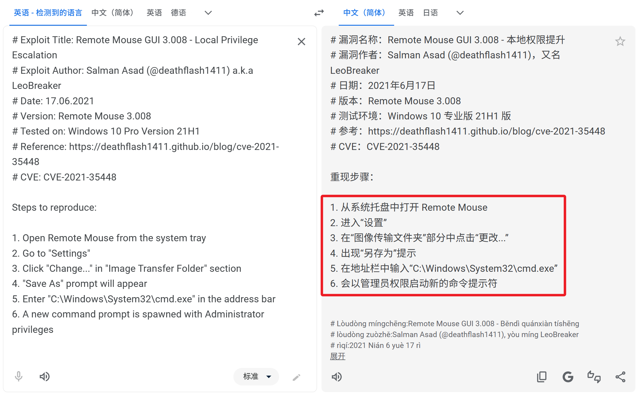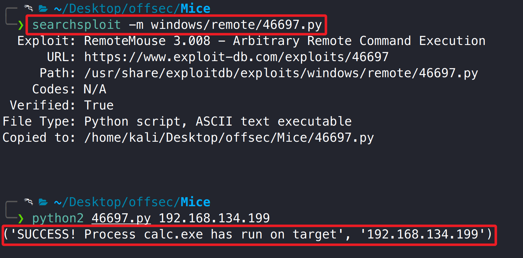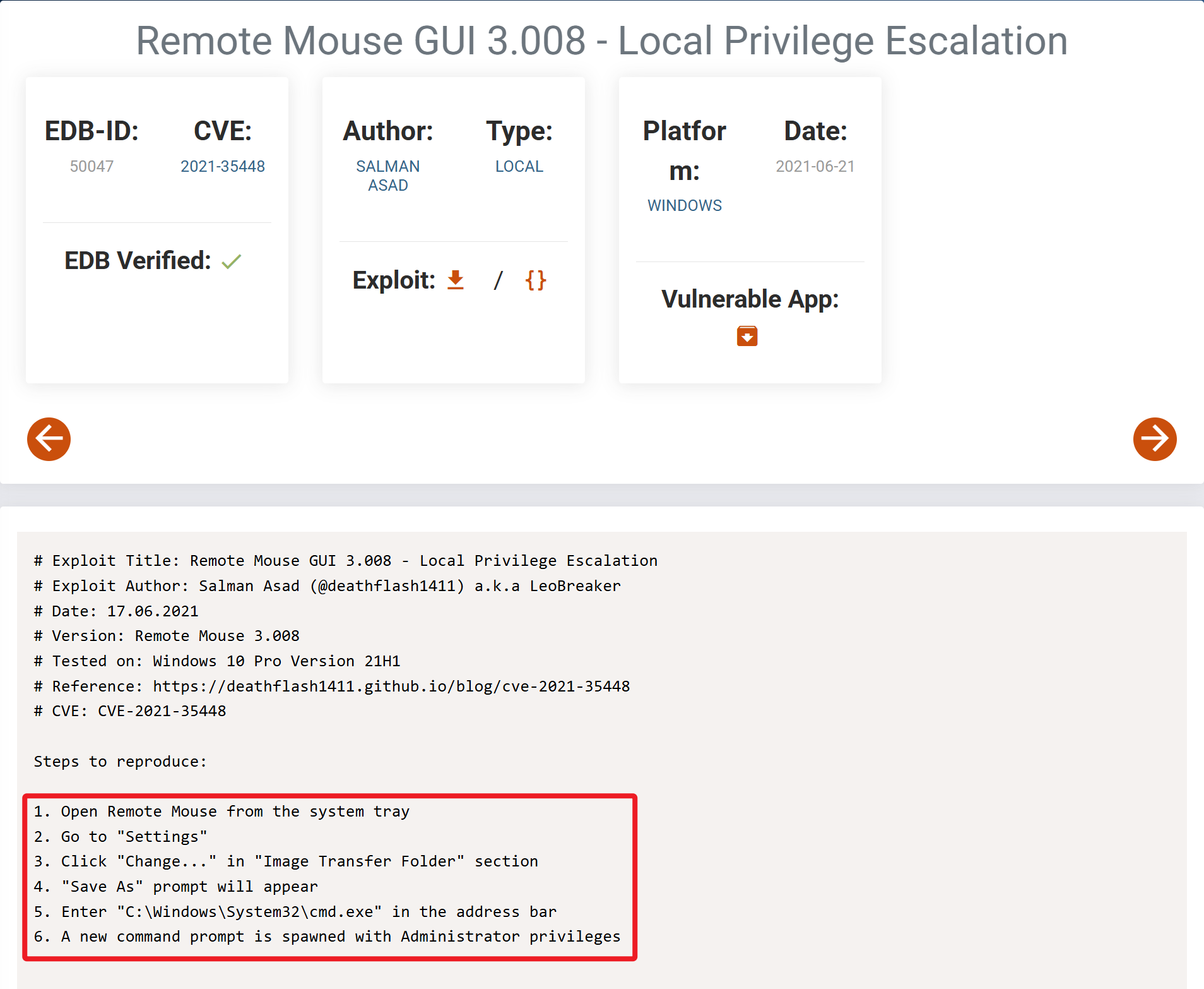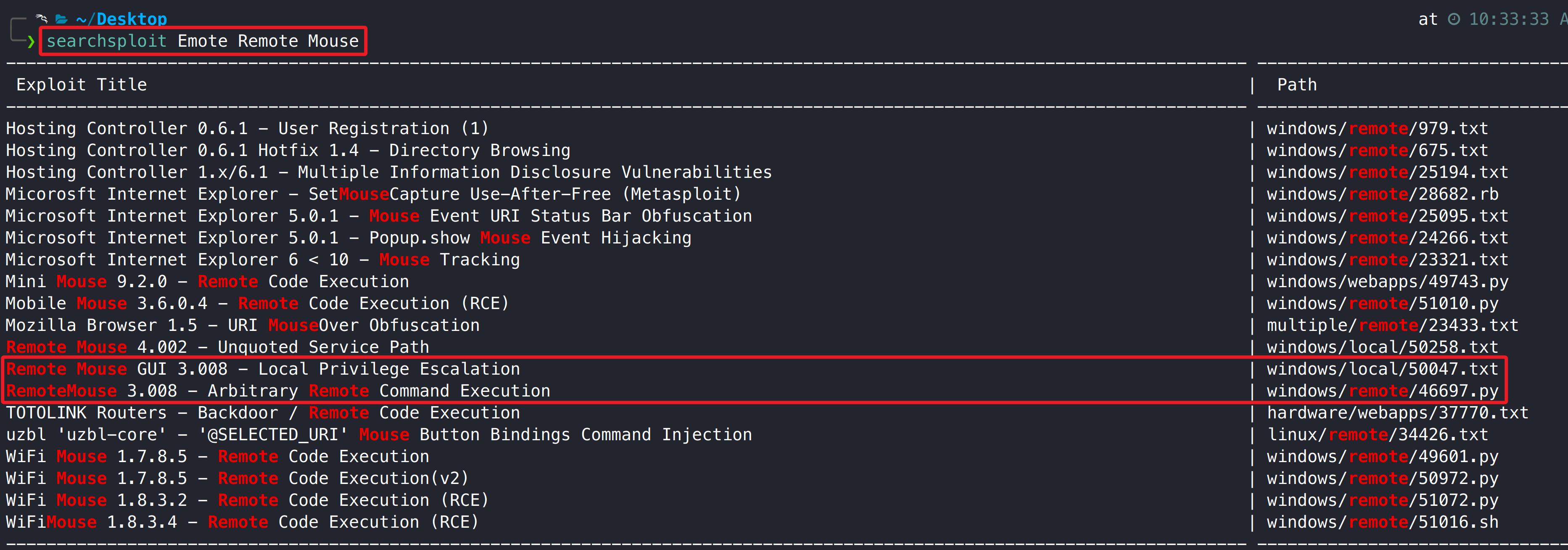 使用 searchsploit 检索 Emote Remote Mouse 历史漏洞,发现存在本地提权和远程命令执行漏洞。