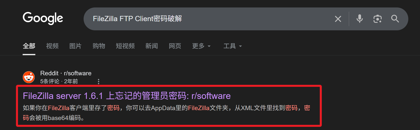 靶机除了一些默认应用还安装了 FileZilla FTP 程序,搜索引擎检索 FileZilla FTP 密码解码,发现本地可能存在包含密码的配置文件。