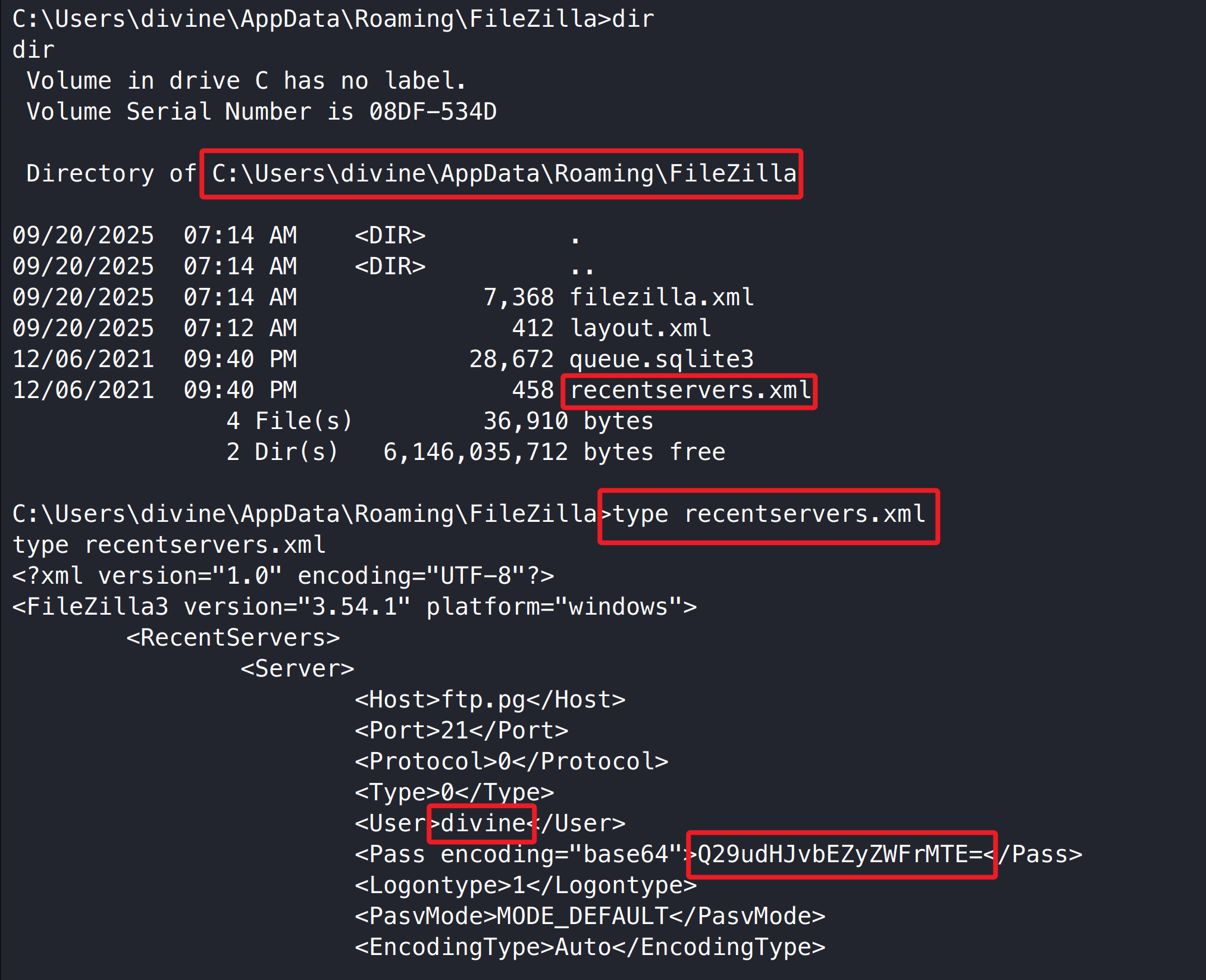 经过一番查找,在 C:\Users\divine\AppData\Roaming\FileZilla 目录发现了 FileZilla xml 配置文件,包含有 divine 用户 base64 格式密码。