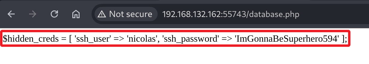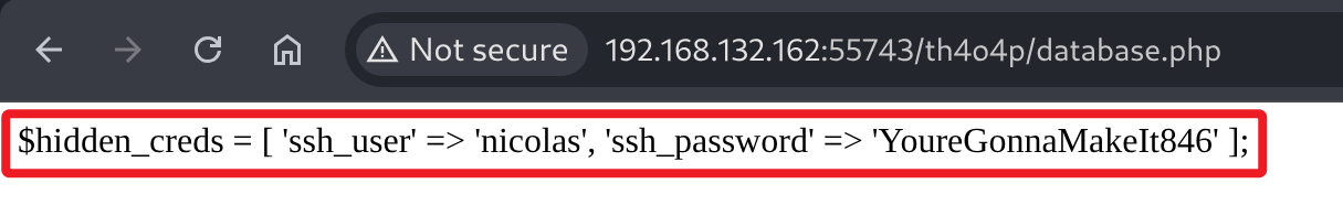 如果尝试对根目录和 th4o4p 目录进行目录枚举,可以发现两个 database.php 文件,而且两个文件都包含有 nicolas 用户密码,事实上这属于靶机的意外攻击路径,不需要文件包含漏洞也可以得到靶机 ssh 登录密码。