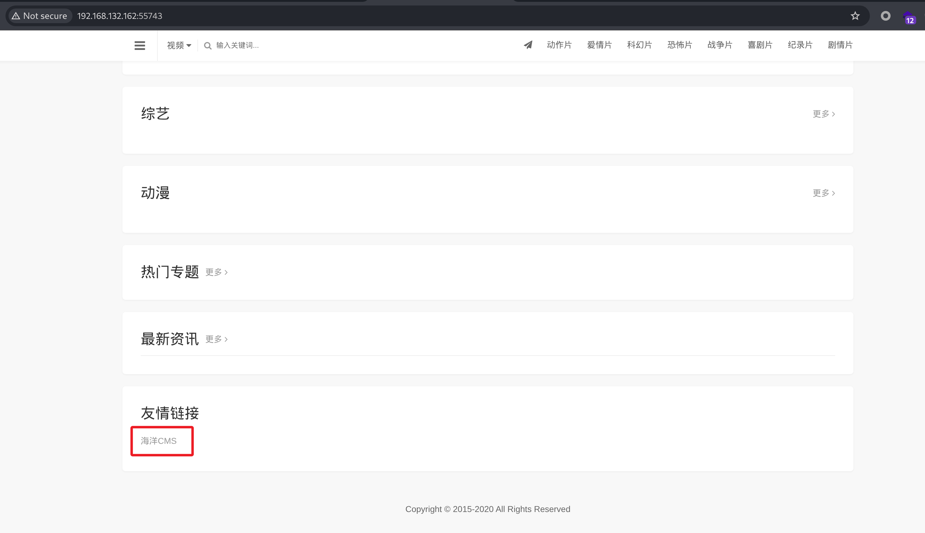 依次访问靶机 HTTP 80 55743,通过页面信息得知 HTTP 55743 部署了海洋 CMS(Seacms )。