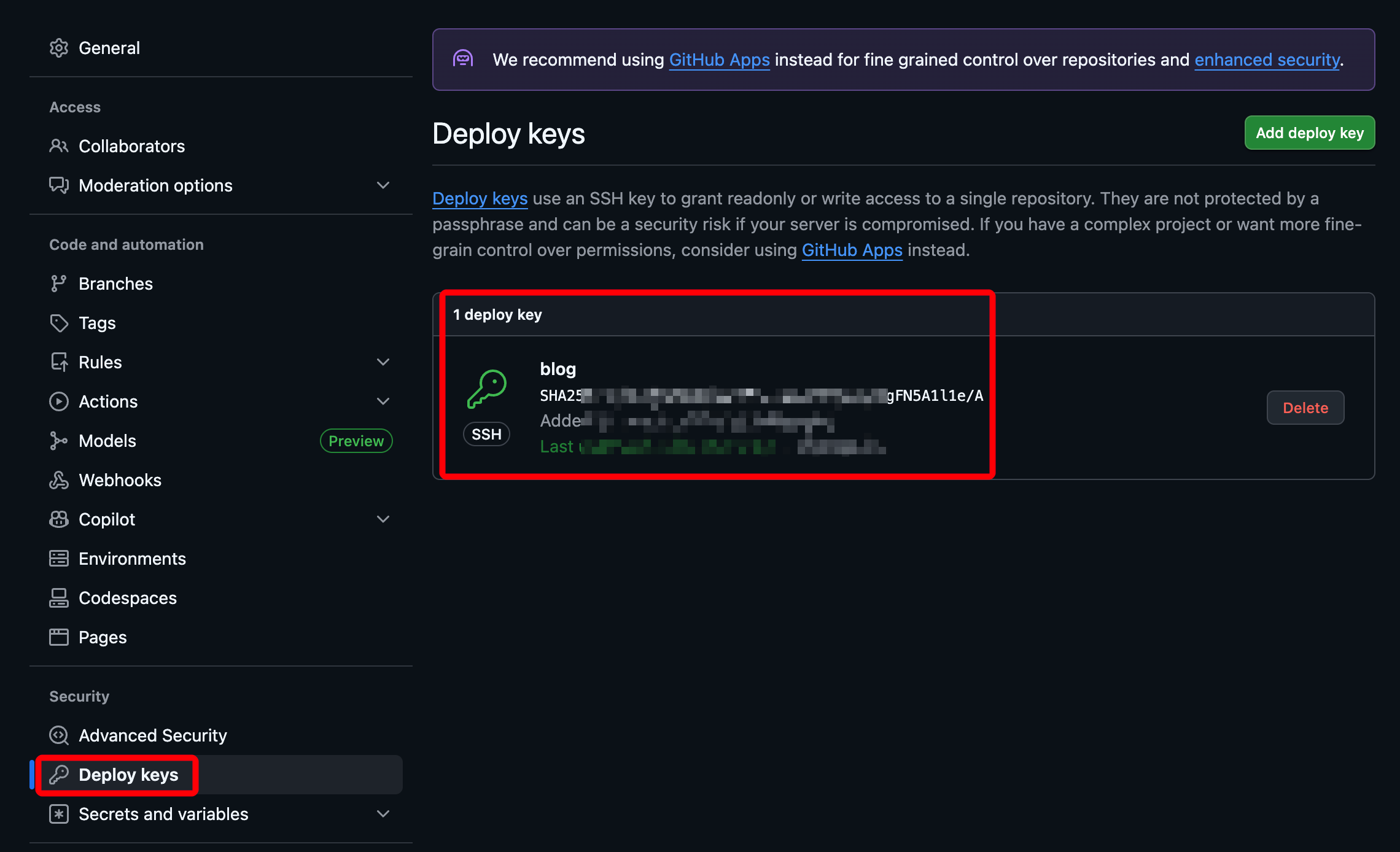 配置 ssh 私钥进行 Git 上传,点击存储库Settings-Deploy keys,将本地生成的 ssh 私钥添加至存储库。