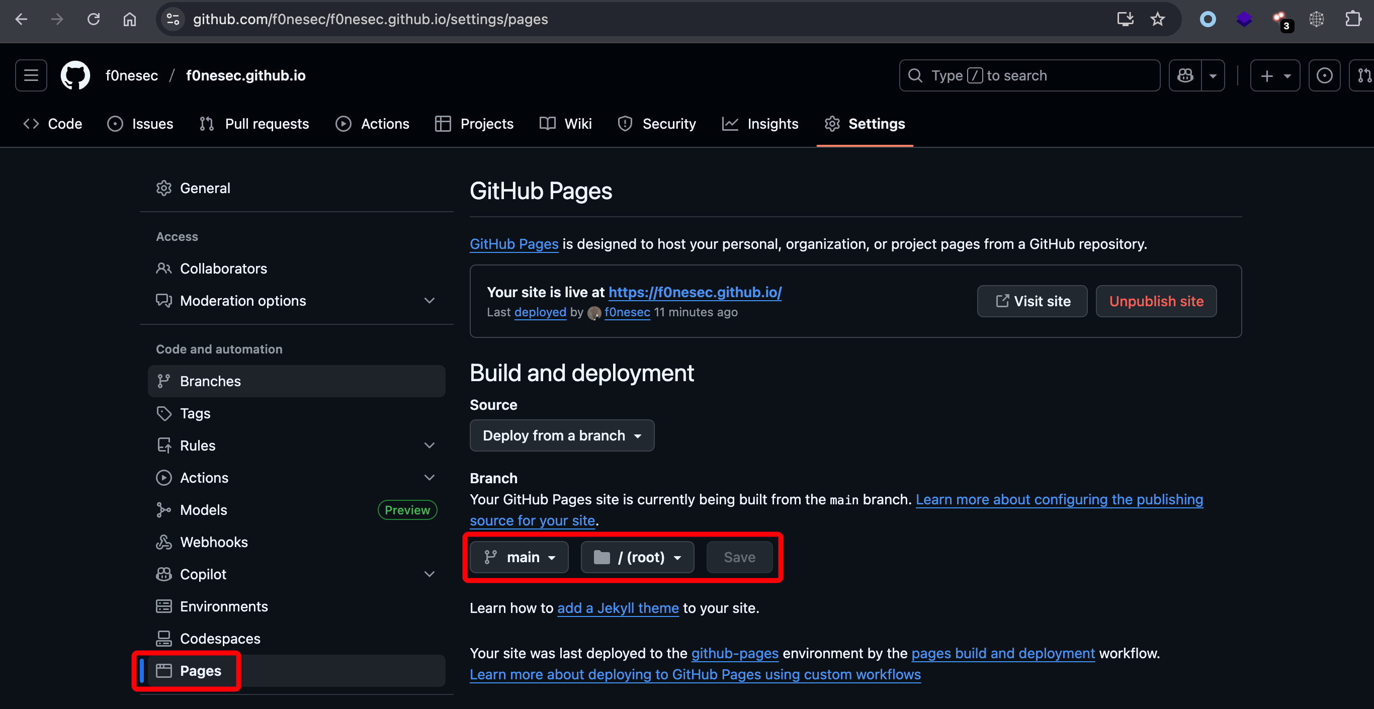 点击存储库Settings-pages页面,设置 GitHub Pages main 分支代码部署(上传 main 分支默认会自动开启部署)。