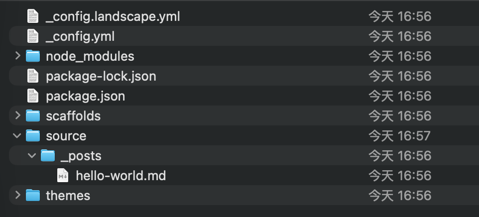 _config.yml:Hexo 的核心配置文件,包含一些全局配置信息。node_modules:插件目录,必要的时候需要修改一些插件配置信息,注意: 每个项目都有自己的插件目录,如果历史已经下载了某个插件,后来又新建了一个项目,该项目不会加载历史安装的插件,而是需要我们重新执行安装:npm install hexo-deployer-git --save。source:包含我们写的 markdown 文件,其中_posts为默认的文章目录,存放首页文章内容,通过hexo new name创建的页面会单独在source创建一个目录。themes存放主题目录,我们可以下载开发者创建好的主题,放置到该目录,通过修改项目的_config.yml文件theme字段使用不同主题,当然如果直接通过npm下载主题则会放置到node_modules目录。