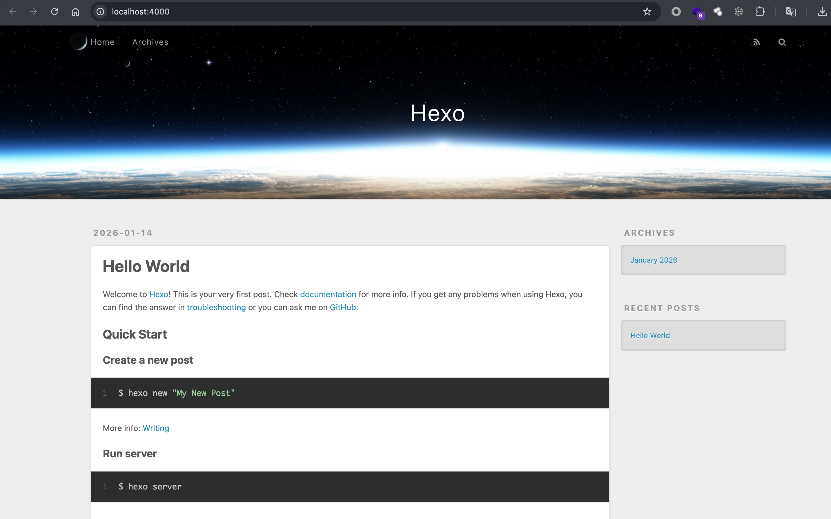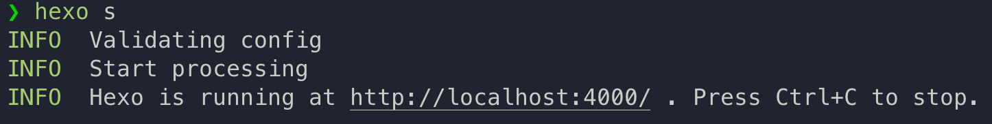 通过 hexo s 启动项目,如果没有任何报错,访问 http://locahost:4000 即可查看初始的网站内容。