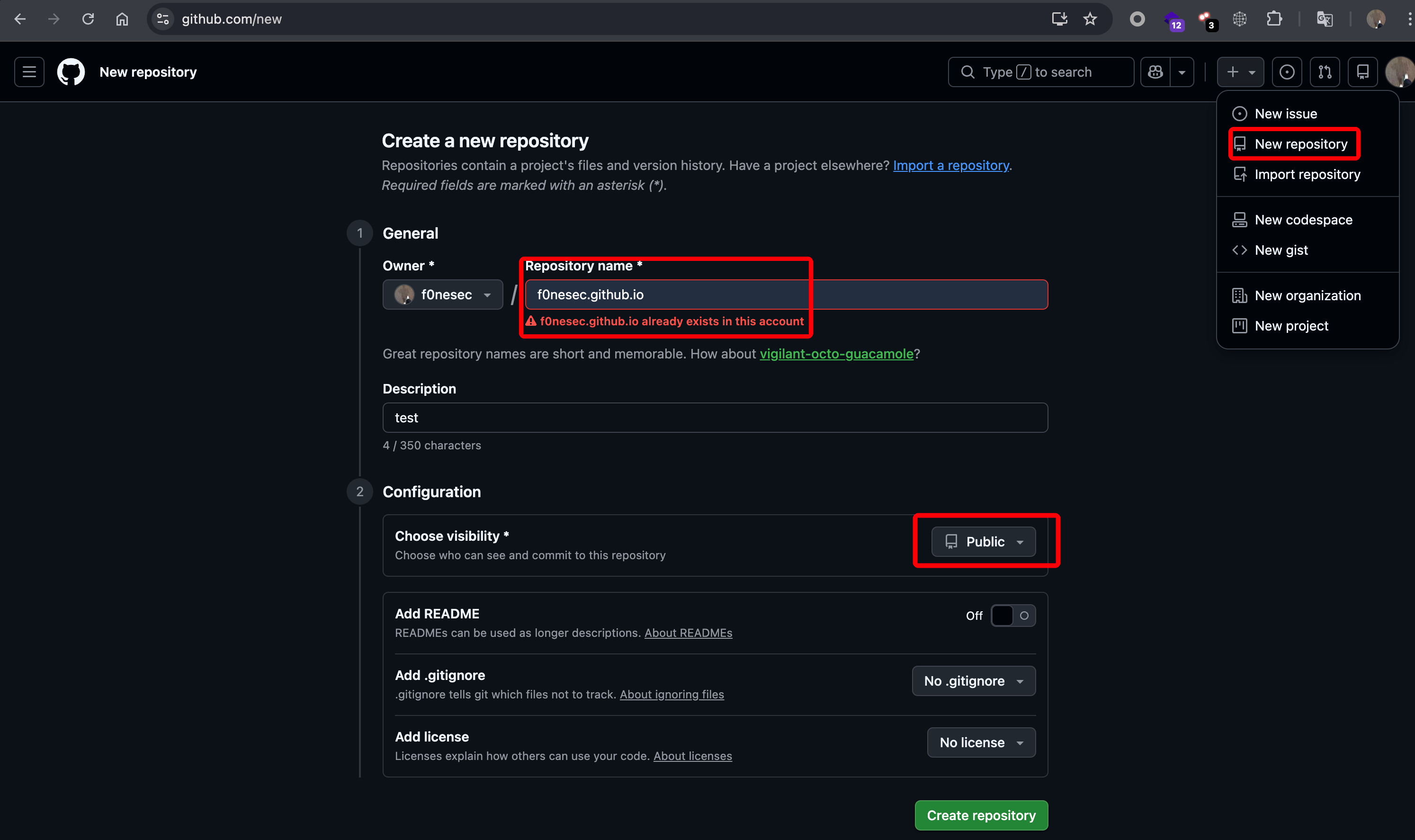 登录 GitHub,点击创建储存库,然后输入自己 GitHub 名称,其余保持默认,注意: 一定要满足 username.github.io 格式,其中 username 为自己 GitHub 名称,其次,一定要选择共享,否则无法开启 GitHub Pages。