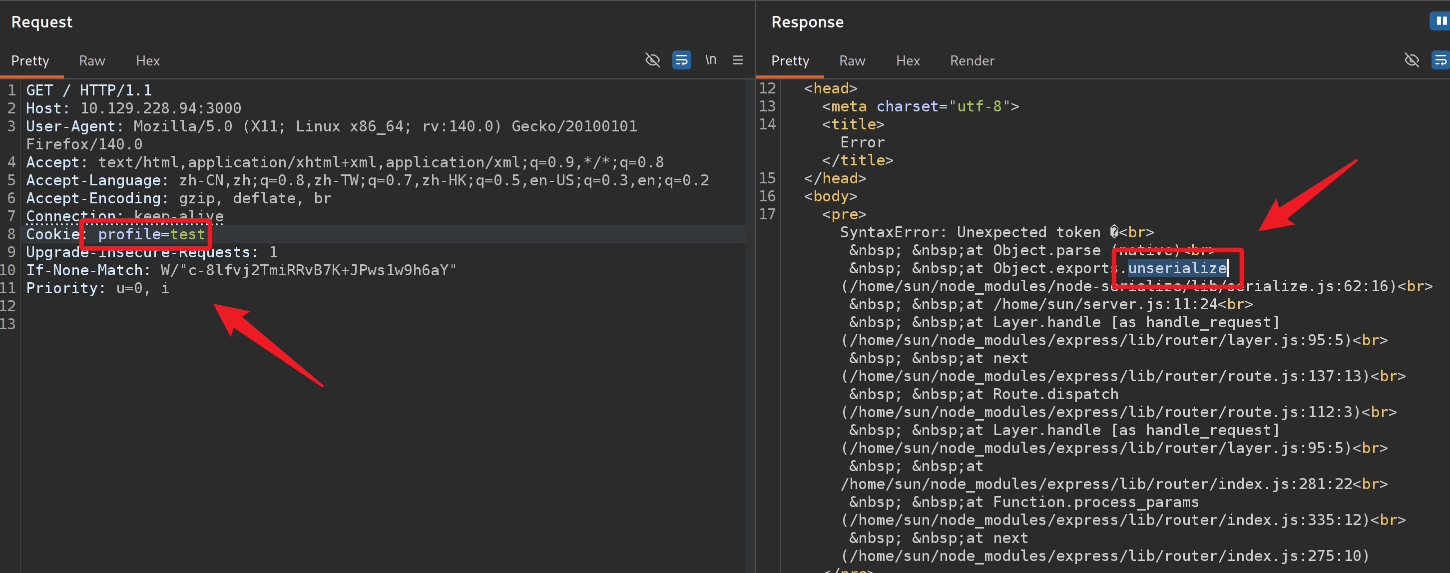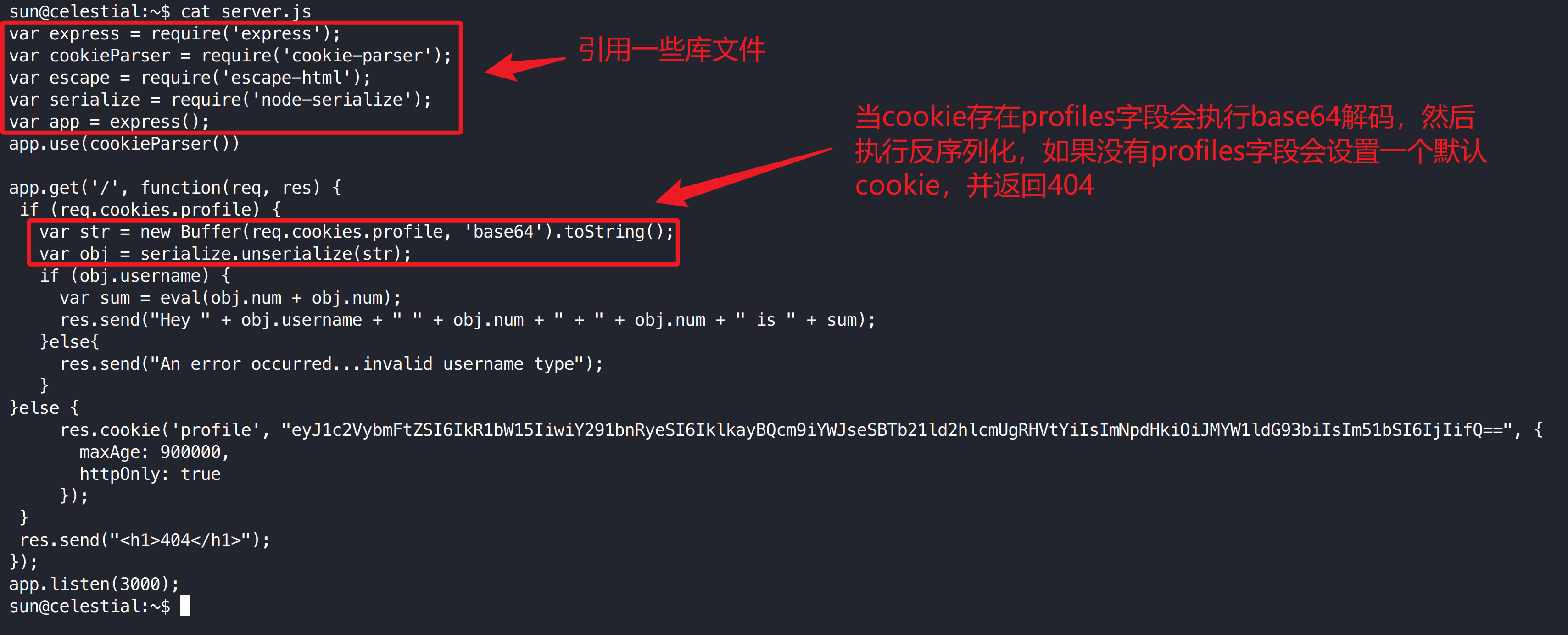 漏洞分析: 程序会从 Cookie 中读取 profiles 字段并进行 Base64 解码,随后直接调用 node-serialize 的 unserialize() 进行反序列化,但未进行任何安全校验。node-serialize 在反序列化时如果检测到 _$$ND_FUNC$$_ 标记,会通过 eval 执行其后的 JavaScript 代码。攻击者可以构造包含恶意函数的序列化数据并进行 Base64 编码,通过 profiles Cookie 传递给服务器。当服务器反序列化该数据时,恶意代码会被执行,从而造成远程代码执行(RCE)。