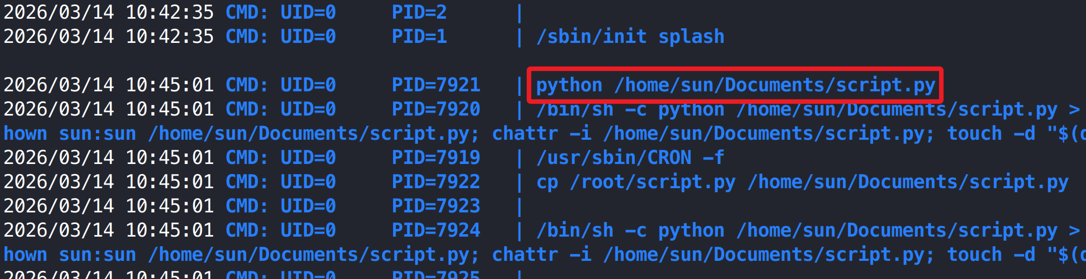 3.3 提权获取系统最高权限 3.3.1 修改计划任务脚本提权至 root 权限 上传 pspy 工具监控系统进程,发现系统会定时以 root 权限执行 script.py 脚本,且该脚本当前用户是可修改的,将反弹 shell 写入脚本中,等待任务执行再次执行脚本即可得到系统 root 用户权限。