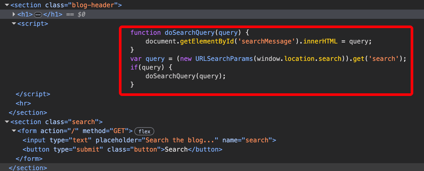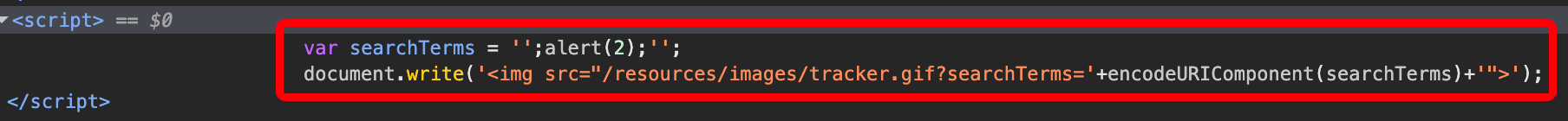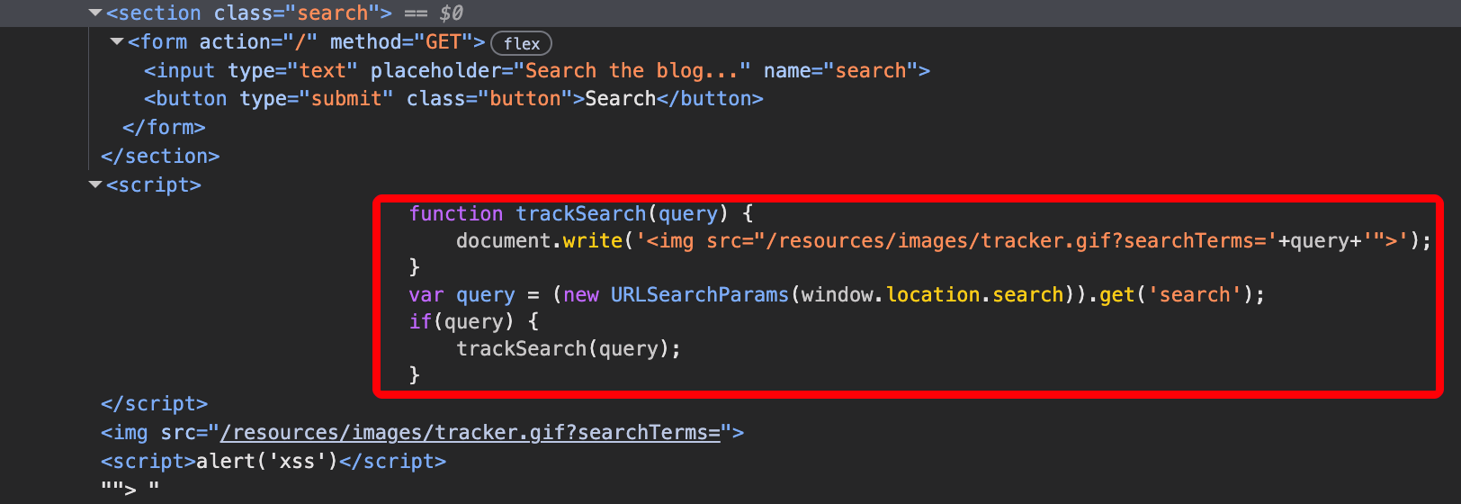 与反射型和存储型不太一样,DOM 型需要查看页面执行脚本构建 payload,点击检查,定位到搜索元素,在下方会定义一个 javascript 脚本,该脚本定义了一个 trackSearch 函数,并在下方执行了该函数,通过 search 传入 query 参数,最后将 query 内容直接传入 document.write 执行,未进行任何过滤,只需要将 img 标签闭合,即可触发 XSS 弹窗。