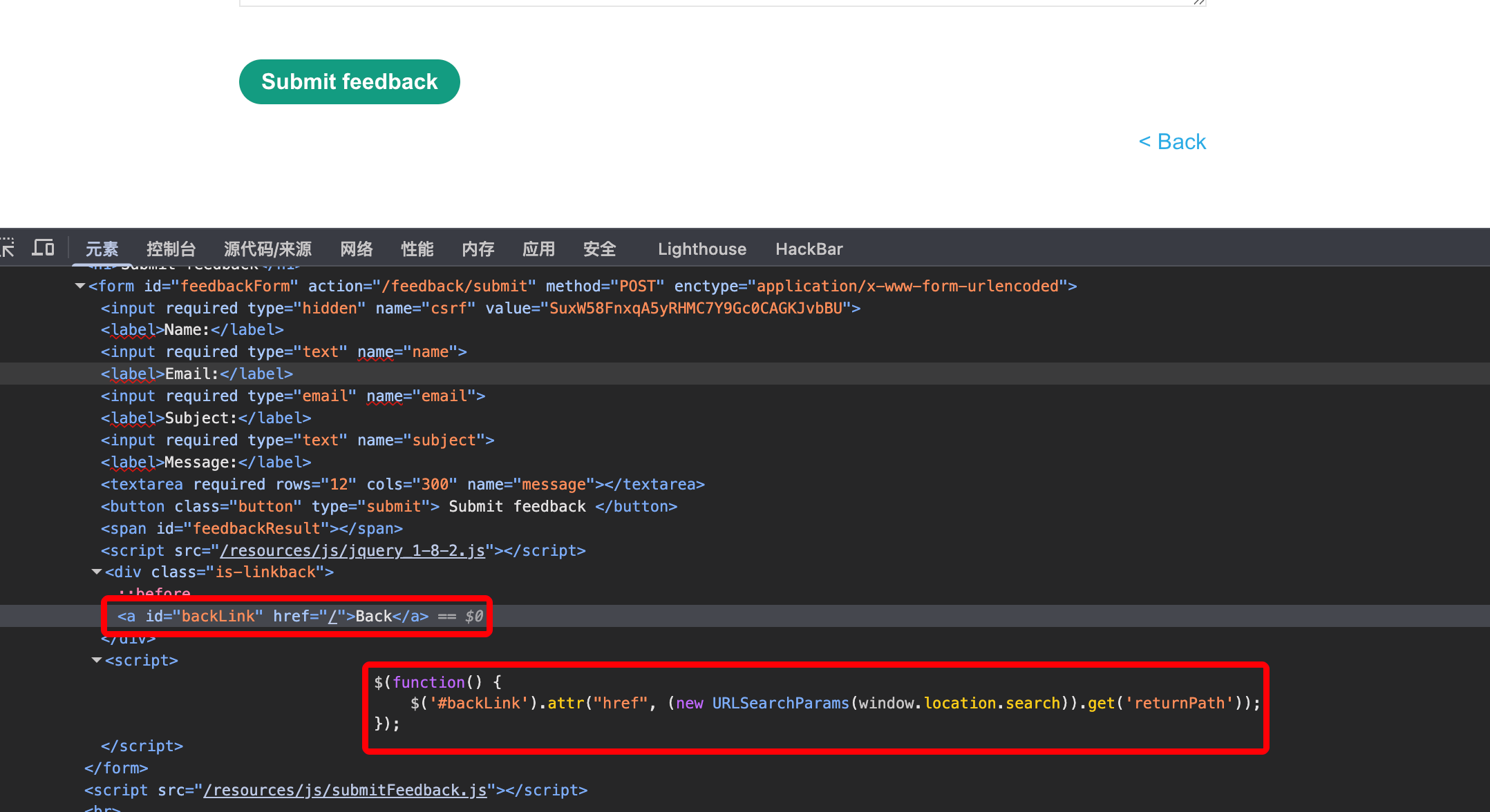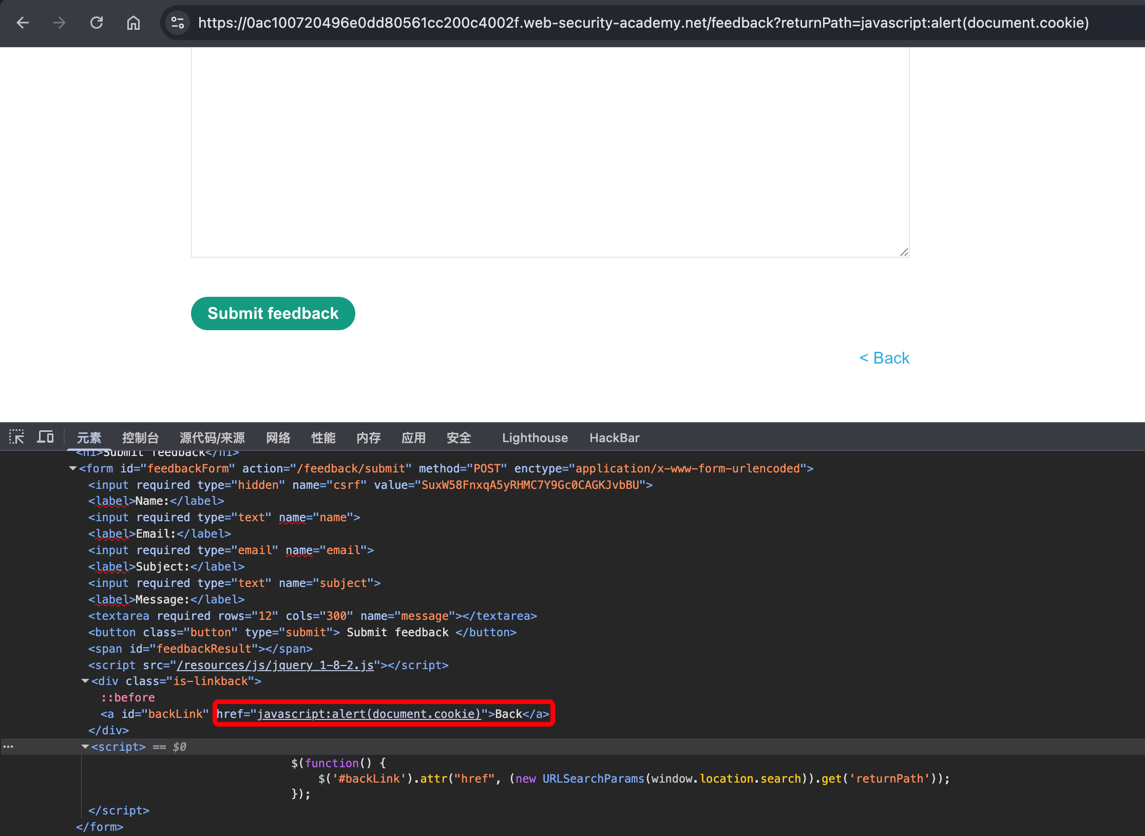 提示: 反馈提交页面存在基于 DOM 的 XSS 漏洞。页面使用 jQuery 的 $ 选择器获取锚点元素,并将 location.search 中的数据写入其 href 属性。可通过构造 javascript: 协议控制 Back 链接,使其在点击时执行 alert(document.cookie),完成实验。