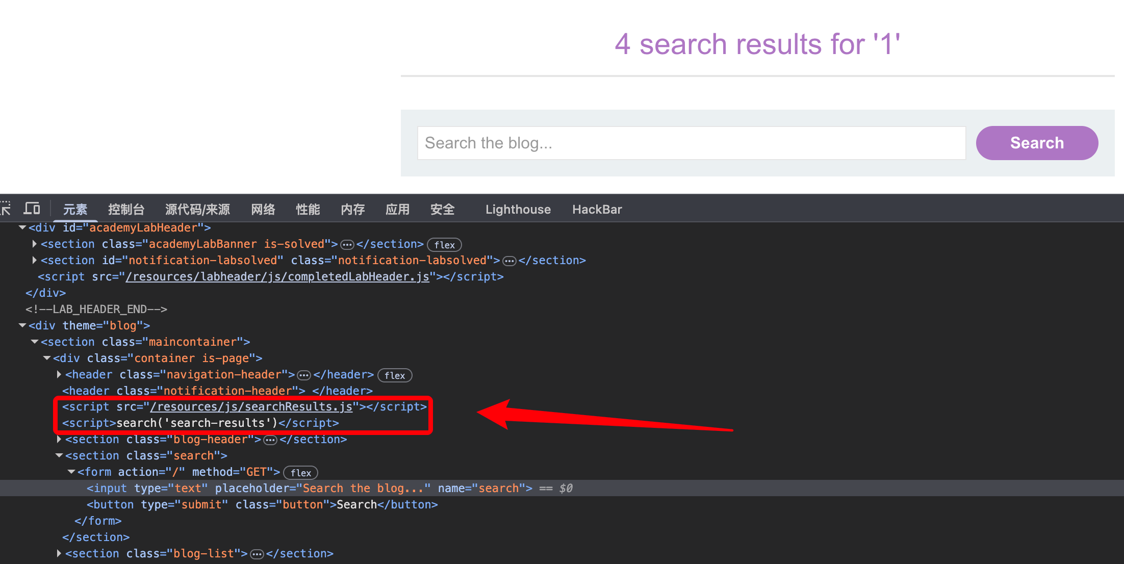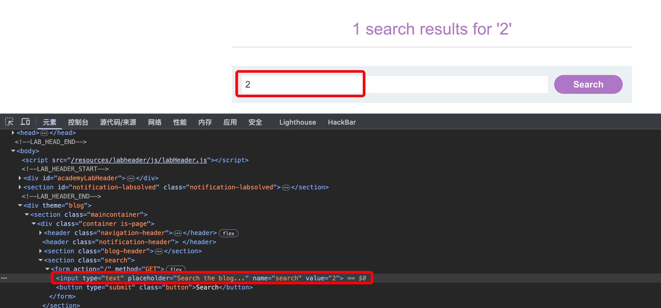 提示: 搜索功能存在反射型 XSS 漏洞。用户输入会回显到 HTML 属性中,虽然尖括号被进行了 HTML 编码,但仍可通过构造新的属性并绑定事件处理函数,调用 alert() 完成实验。