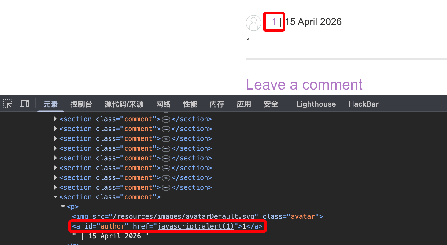 提示: 评论功能存在存储型 XSS 漏洞。评论作者姓名对应的链接地址会被写入锚点的 href 属性中,虽然双引号被进行了 HTML 编码,但仍可通过构造 javascript: 伪协议,在用户点击评论作者姓名时调用 alert(),完成实验。