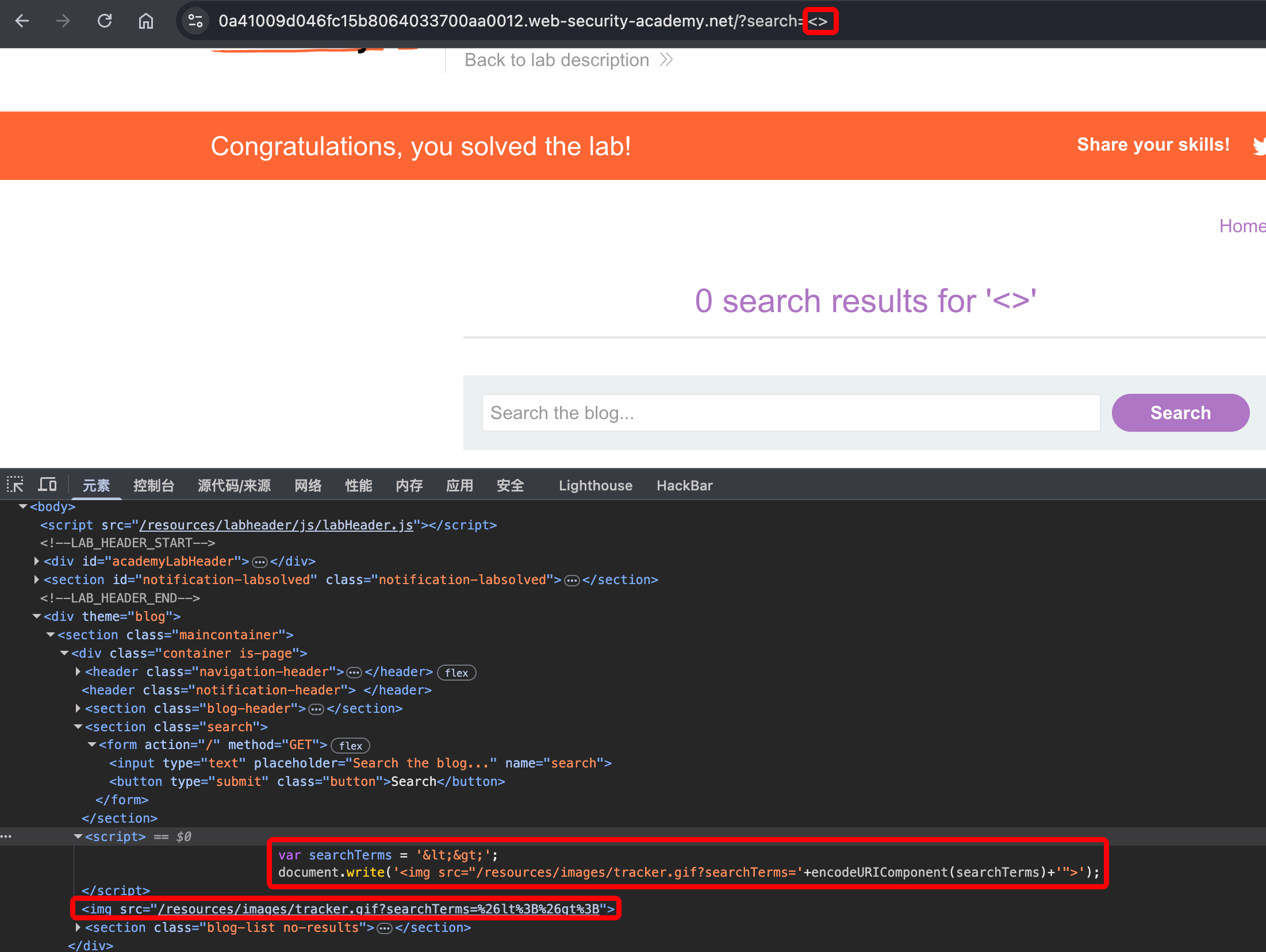提示: 搜索查询跟踪功能存在基于 DOM 的 XSS 漏洞。页面使用 document.write 将 location.search 中的数据直接写入页面,且未进行安全处理,因此可通过构造 URL 参数注入脚本并触发 alert(),完成实验。