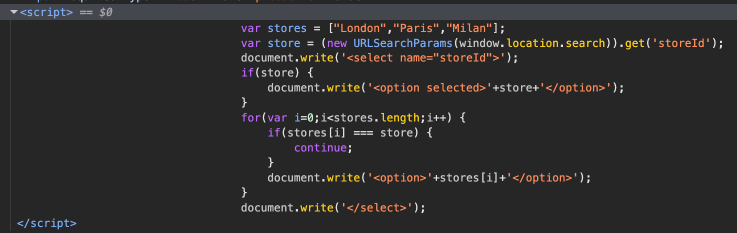 点击商品详情页面,页面可下拉查询商品库存数量,查看页面源码,发现一个 script 脚本内容,脚本接受 URL 的 storeId 参数,然后将其直接插入到页面源码,可通过该参数插入 XSS payload。