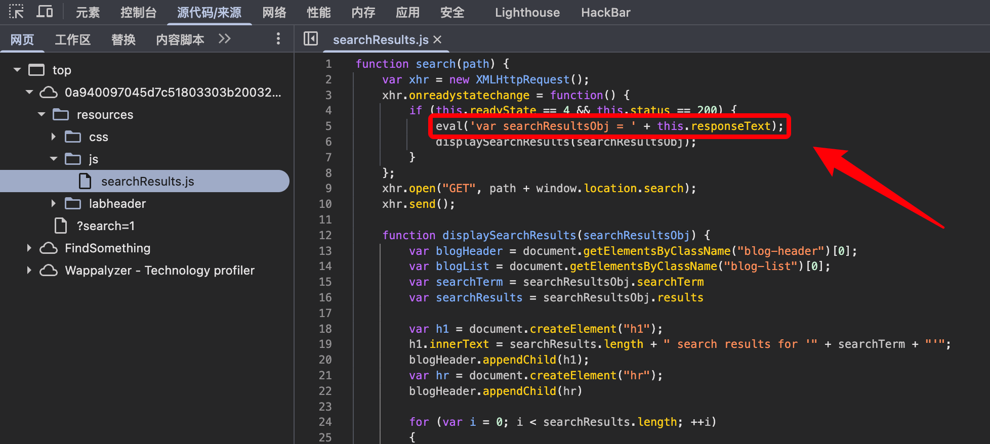 searchResults.js 脚本执行过程会调用 eval 函数,该函数会把请求响应结果赋值给 searchResultsObj 变量,请求是通过 GET 方法访问传入 path 和 搜索值的拼接。