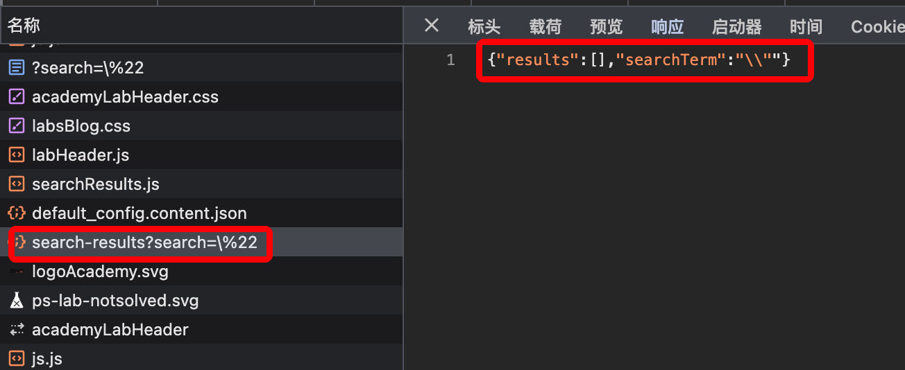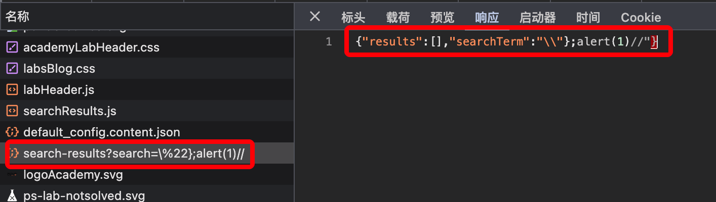 由于 eval 会直接将请求响应的结果赋值给 searchResultsObj 变量,而且输出结果有一项我们是可控的。