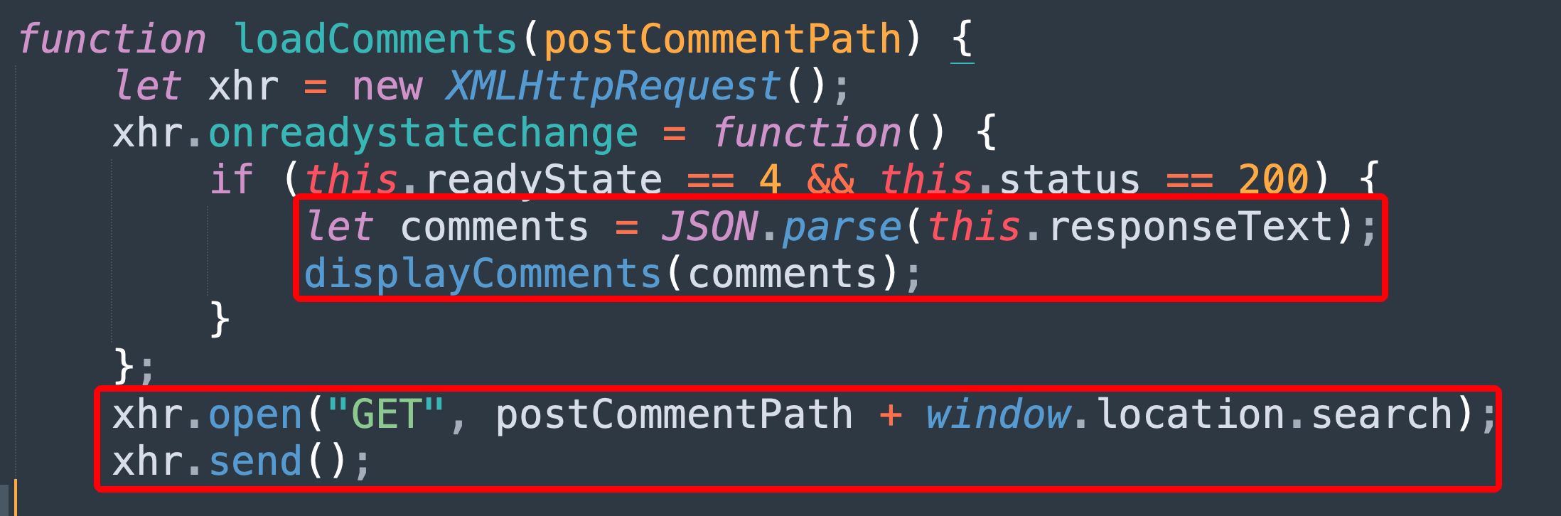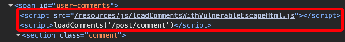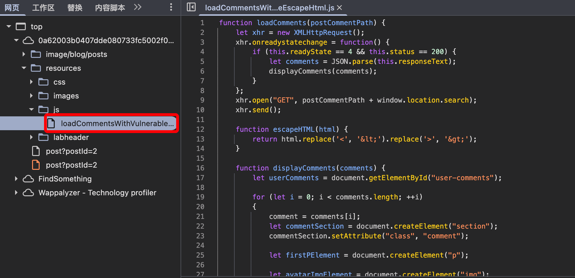 和反射型 XSS 类型,找到评论功能区,检索源码发现页面加载了 loadCommentsWithVulnerableEscapeHtml.js 脚本,并通过 loadComments('/post/comment') 调用。