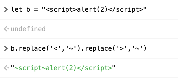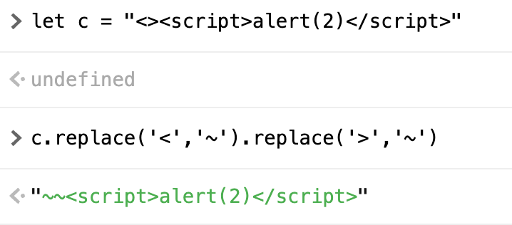 接下来他通过 replace 替换了左右尖括号,在 js 中 replace 默认只替换第一个字符。