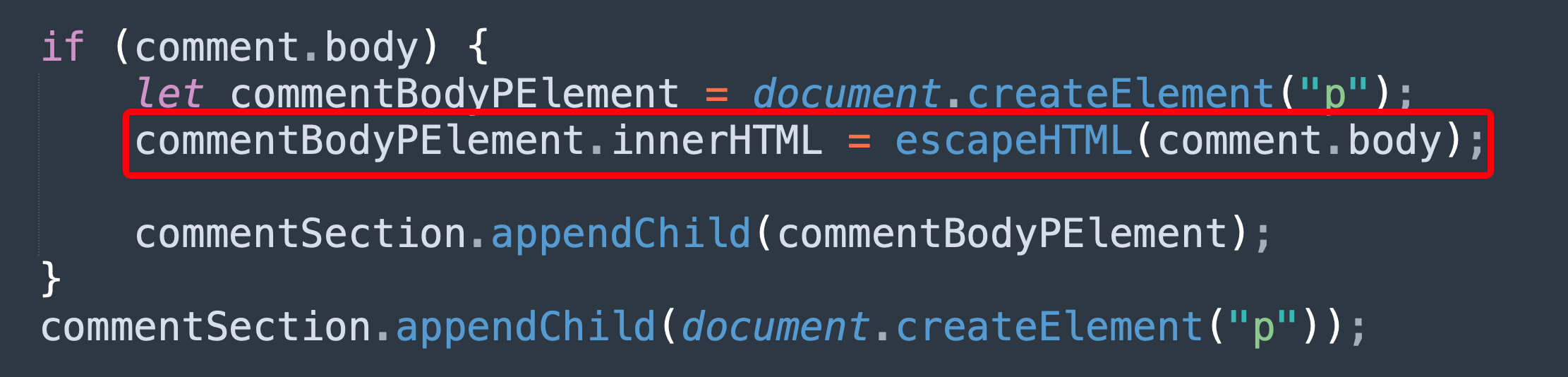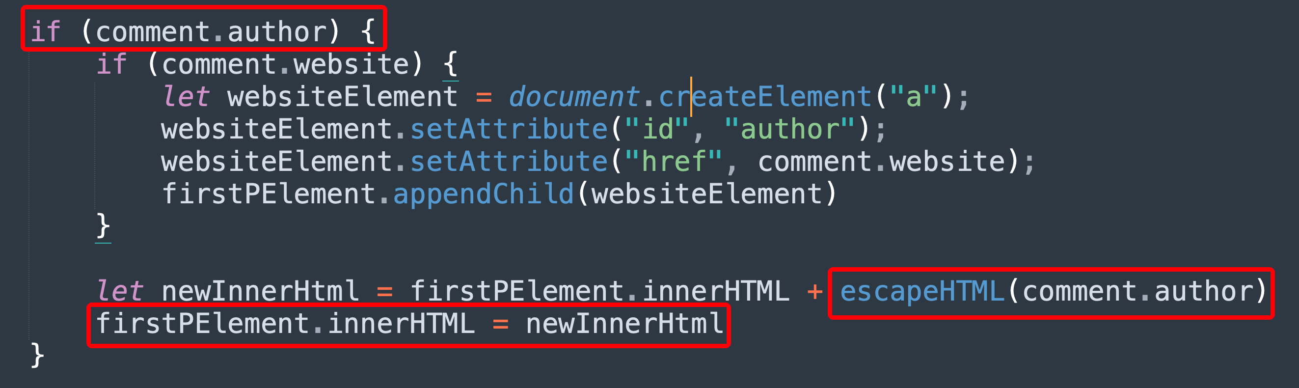 接着查看代码,发现提交作者姓名和评论内容时仅通过刚刚定义的 replace 函数做了一次过滤就做了 HTML 解析,可以尝试 XSS 攻击。