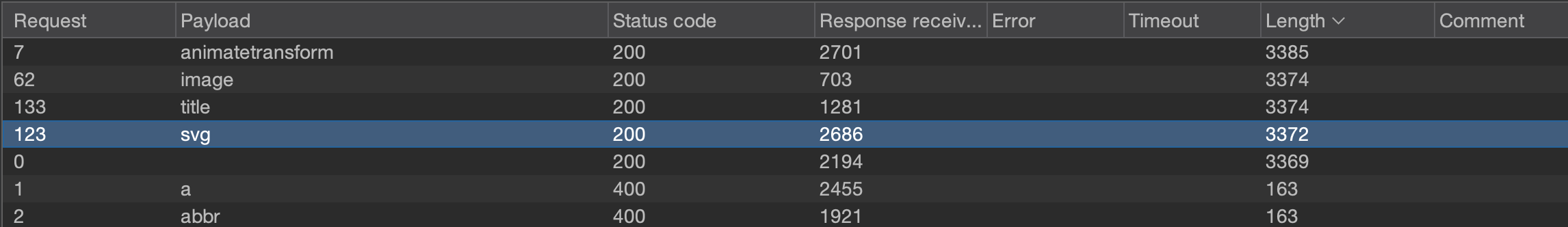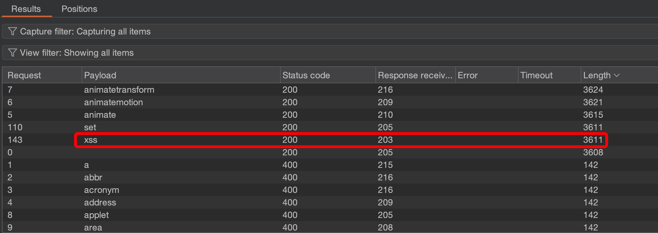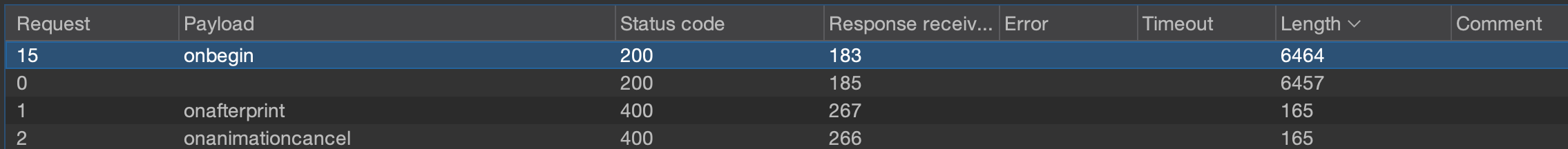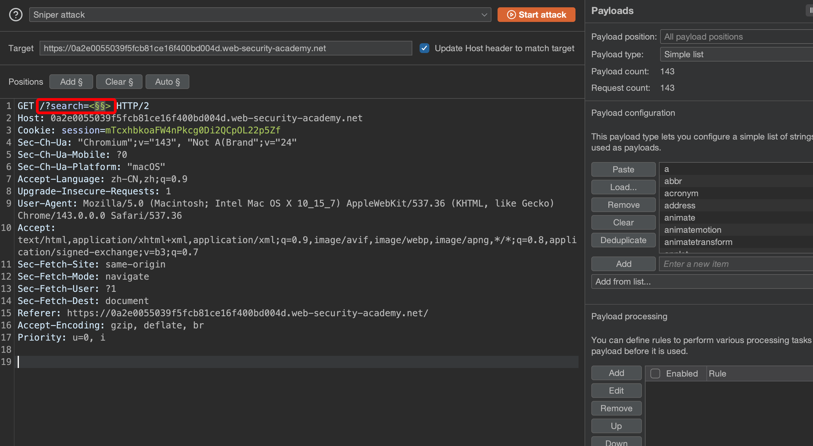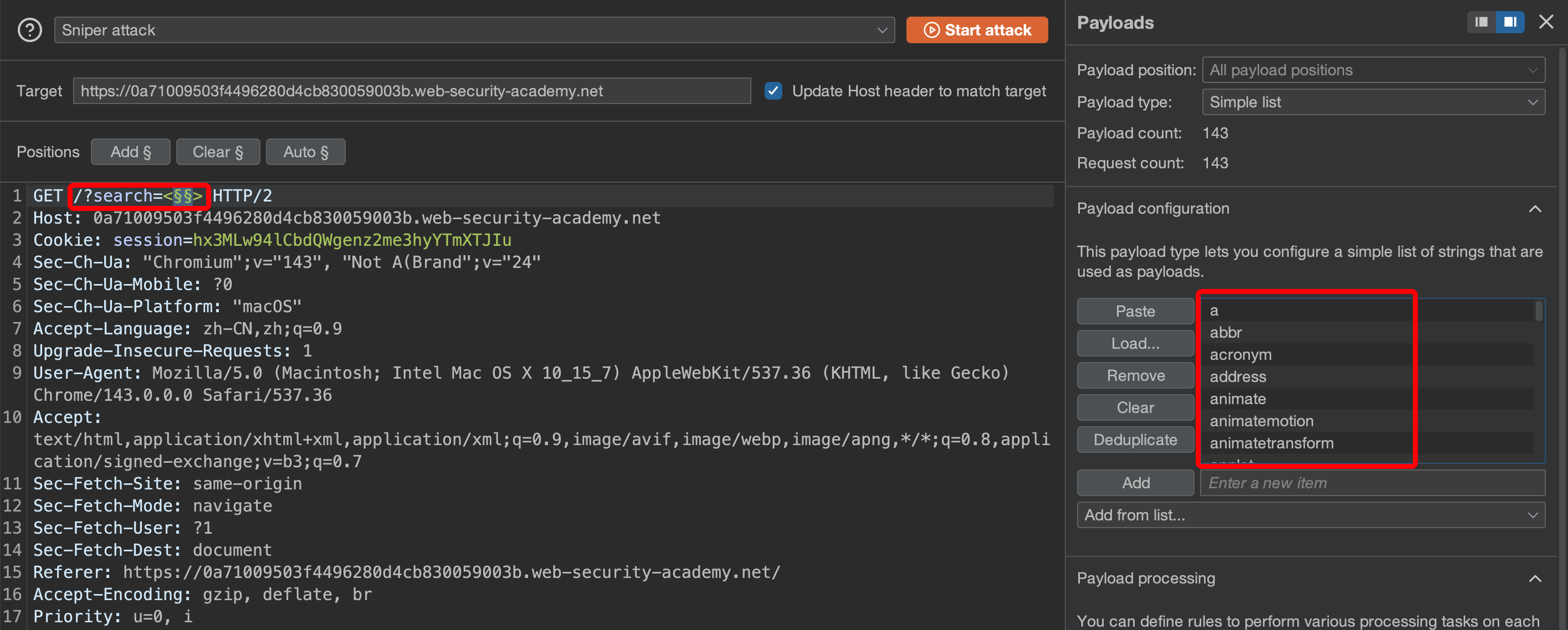 当搜索内容包含 HTML 标签时,服务器会响应 400,复制官方速查表所有标签,然后通过 burp 爆破模块模糊测试。
