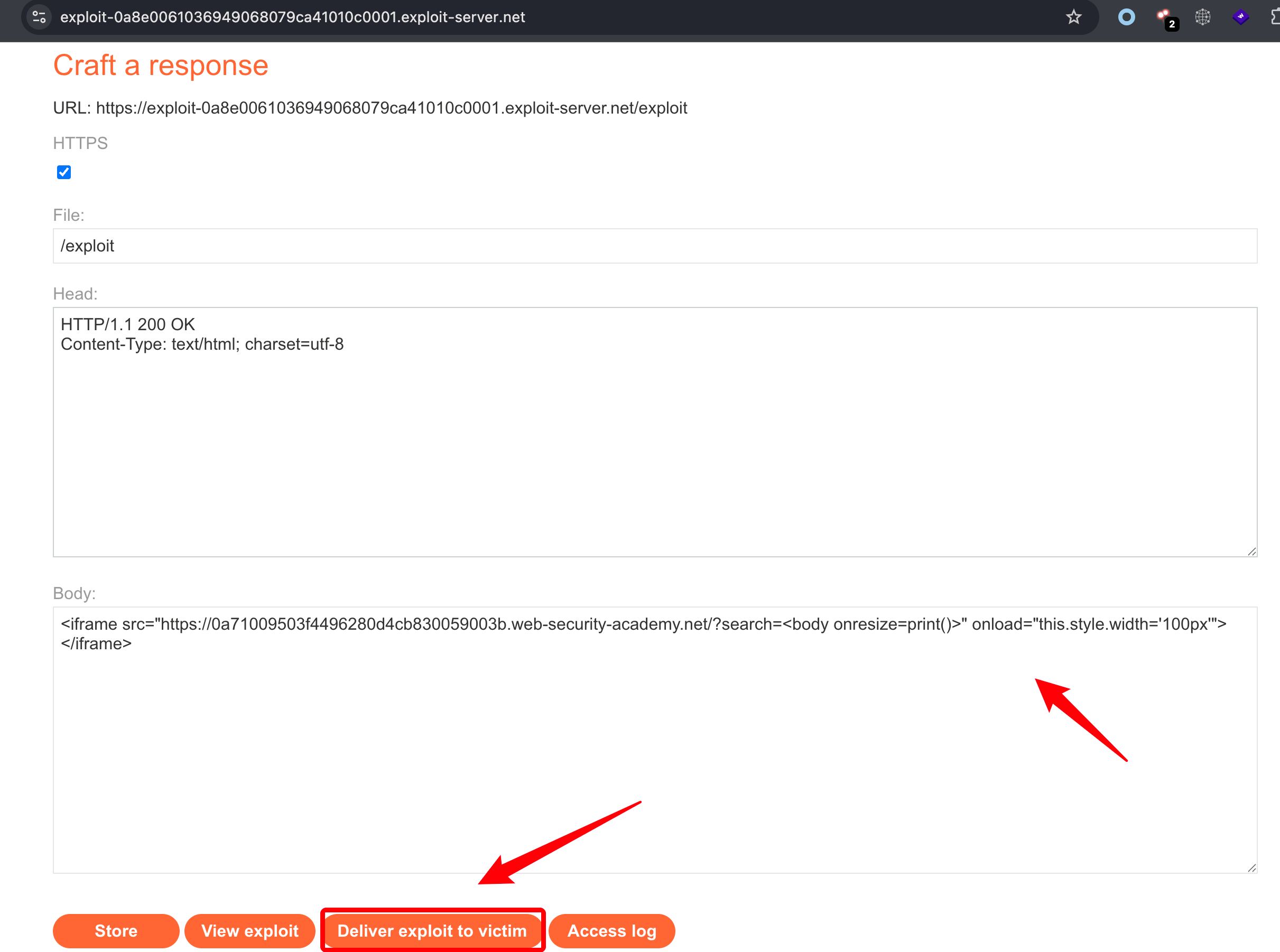 body 标签 onresize 属性不会被拦截,当页面尺寸发生改变该属性的值会被执行,而且该实验需要使用 exploit 平台发送恶意链接,模拟攻击者向受害者发起 XSS 攻击。