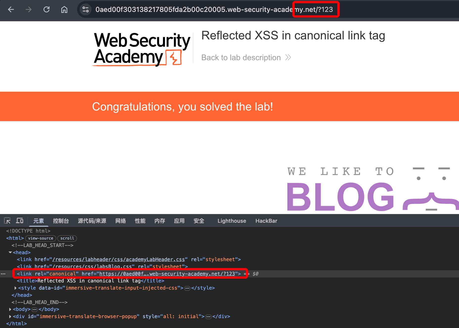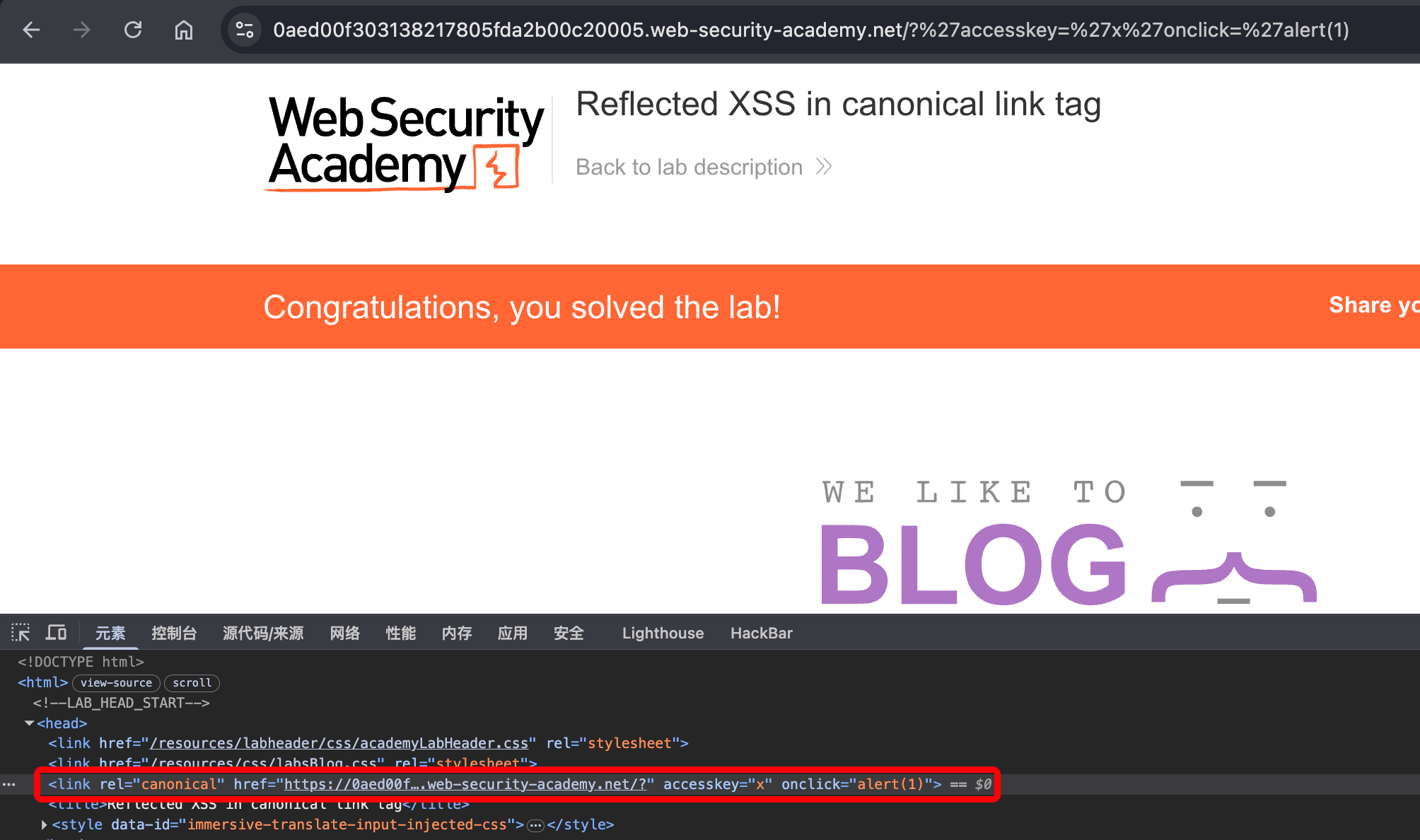 提示: 用户输入会反射到页面的 canonical link 标签属性中,虽然尖括号被进行了转义,但仍可通过闭合原有属性并注入新的事件属性完成利用。可结合 accesskey 与事件处理函数构造 payload,在 Chrome 浏览器中通过指定快捷键触发 alert(),完成实验。