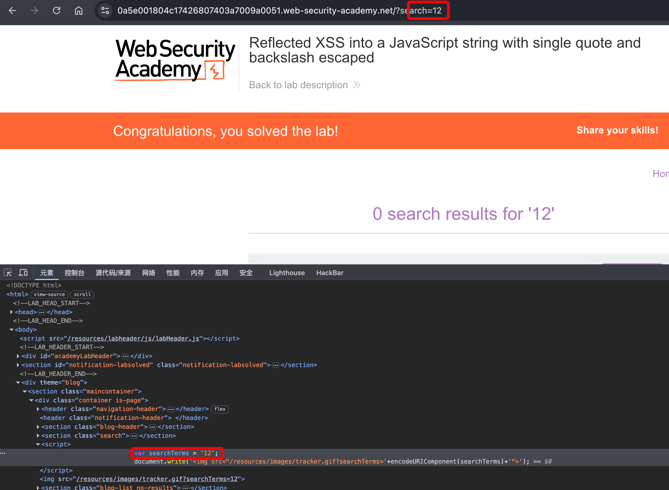 提示: 搜索查询跟踪功能存在反射型 XSS 漏洞。用户输入会回显到 JavaScript 字符串中,尖括号和双引号会被 HTML 编码,单引号会被反斜杠转义,但反斜杠本身未被处理,因此可通过构造输入突破字符串上下文并执行 alert(),完成实验。