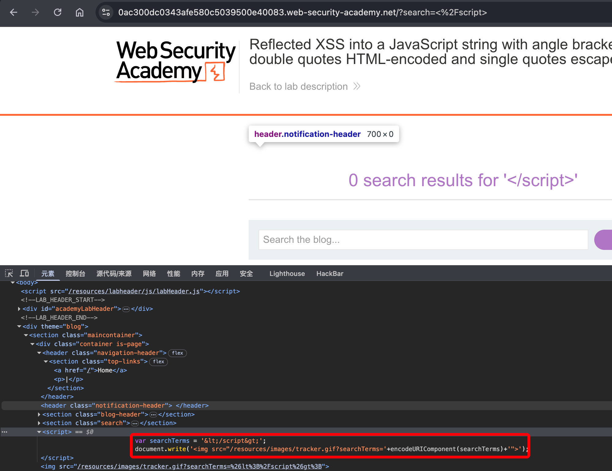 提示: 搜索查询跟踪功能存在反射型 XSS 漏洞。用户输入会回显到 JavaScript 字符串中,虽然尖括号被进行了 HTML 编码,但仍可通过构造输入突破字符串上下文并执行 alert(),完成实验。