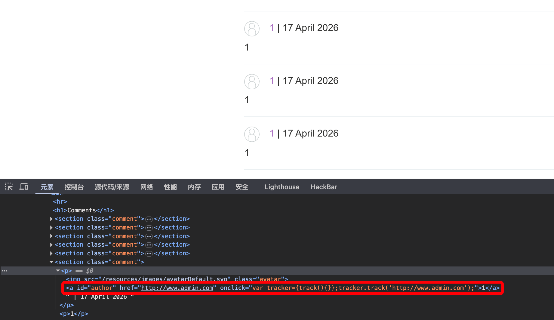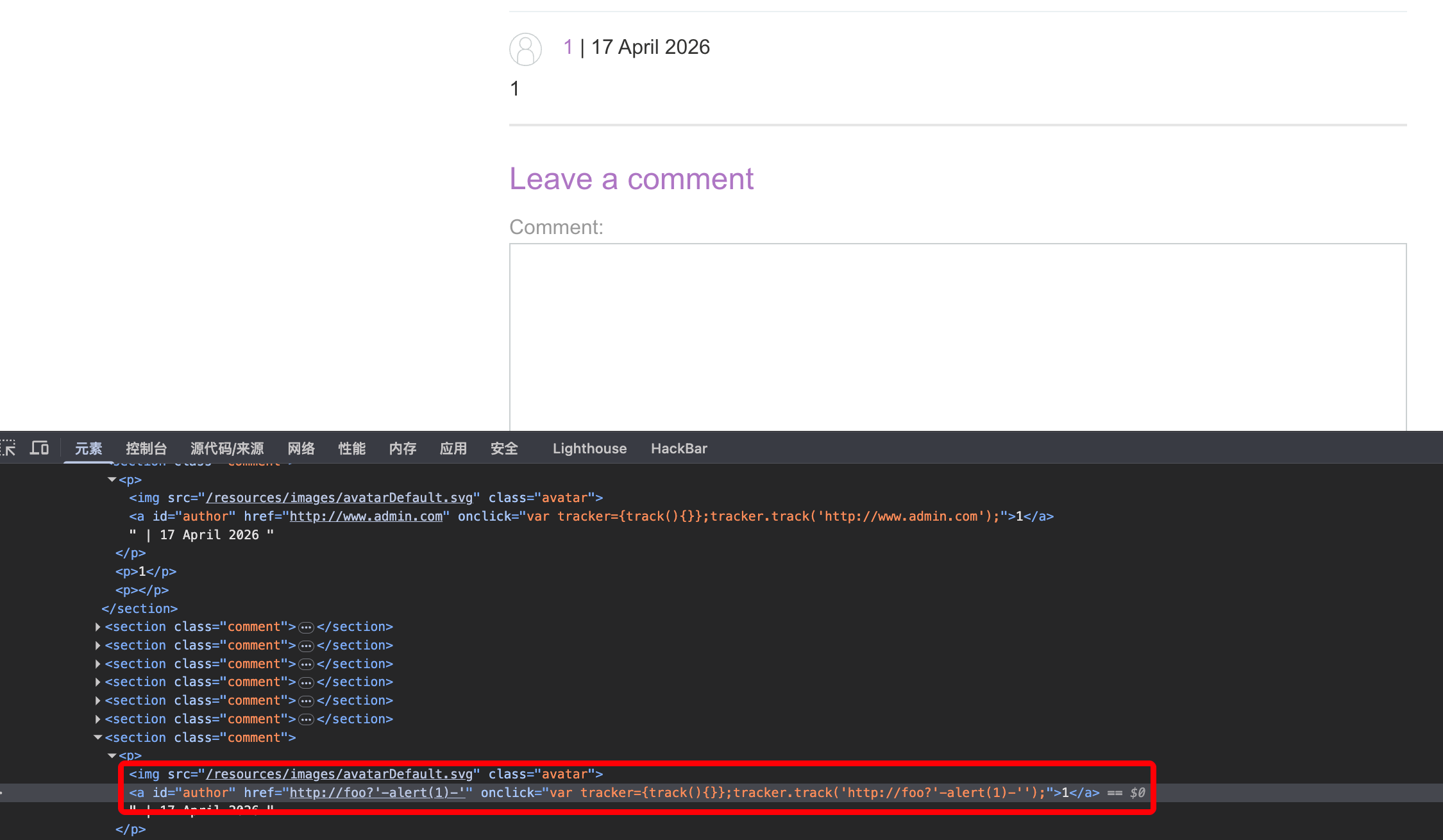 提示: 评论功能存在存储型 XSS 漏洞。用户输入会被写入作者名称对应的 onclick 事件中,尖括号和双引号会被 HTML 编码,单引号与反斜杠会被转义,但仍可通过构造输入突破事件处理函数的字符串上下文,在点击评论作者名称时调用 alert(),完成实验。
