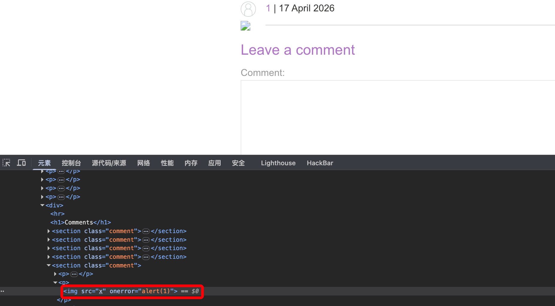 提示: 评论功能存在存储型 DOM XSS 漏洞。用户提交的评论内容会被服务器存储,并在后续页面加载时由前端脚本以不安全的方式处理,最终写入危险 sink,从而触发 alert(),完成实验。