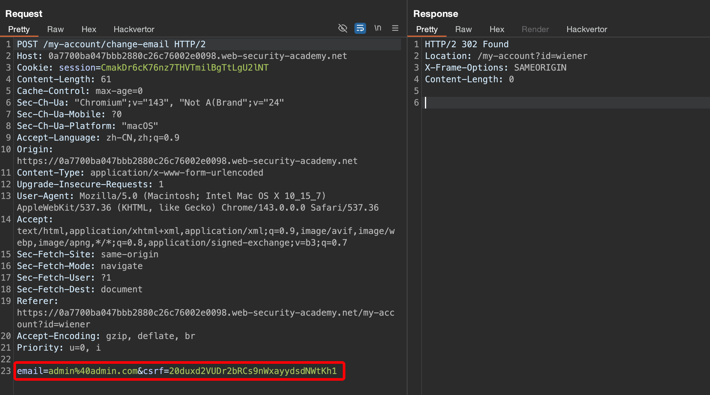 实验室考察通过 XSS 漏洞绕过 CSRF 修改用户邮箱,抓去修改邮箱数据包,修改邮箱请求依赖页面中的 CSRF Token。该 Token 存放在表单隐藏字段中,因此需要先通过 XSS 读取页面中的 csrf 值,再构造修改邮箱请求。