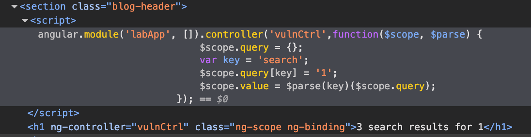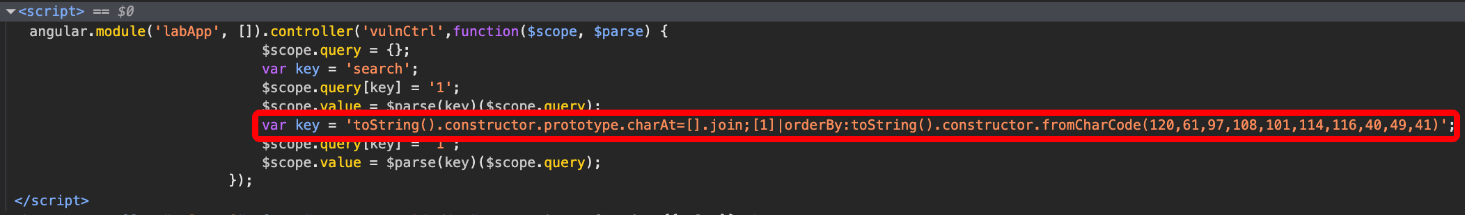 程序原本将 key 固定为 search,并通过 $parse(key) 对其进行解析,再从 $scope.query 对象中取出对应的值。我们需要将绕过 AngularJS 沙箱的 payload 写成 GET 请求参数中执行。