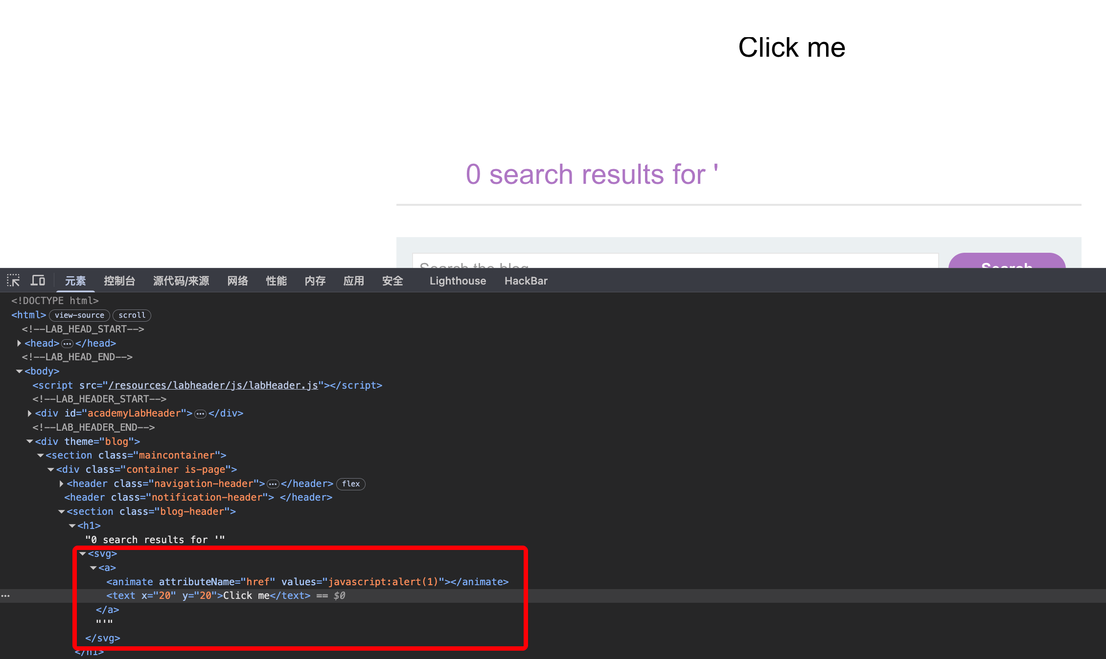提示: 搜索功能存在反射型 XSS 漏洞。页面对常见 HTML 标签进行了过滤,但部分 SVG 标签及相关事件仍可使用,因此可通过构造 SVG 标签并绑定可执行事件,调用 alert() 完成实验。