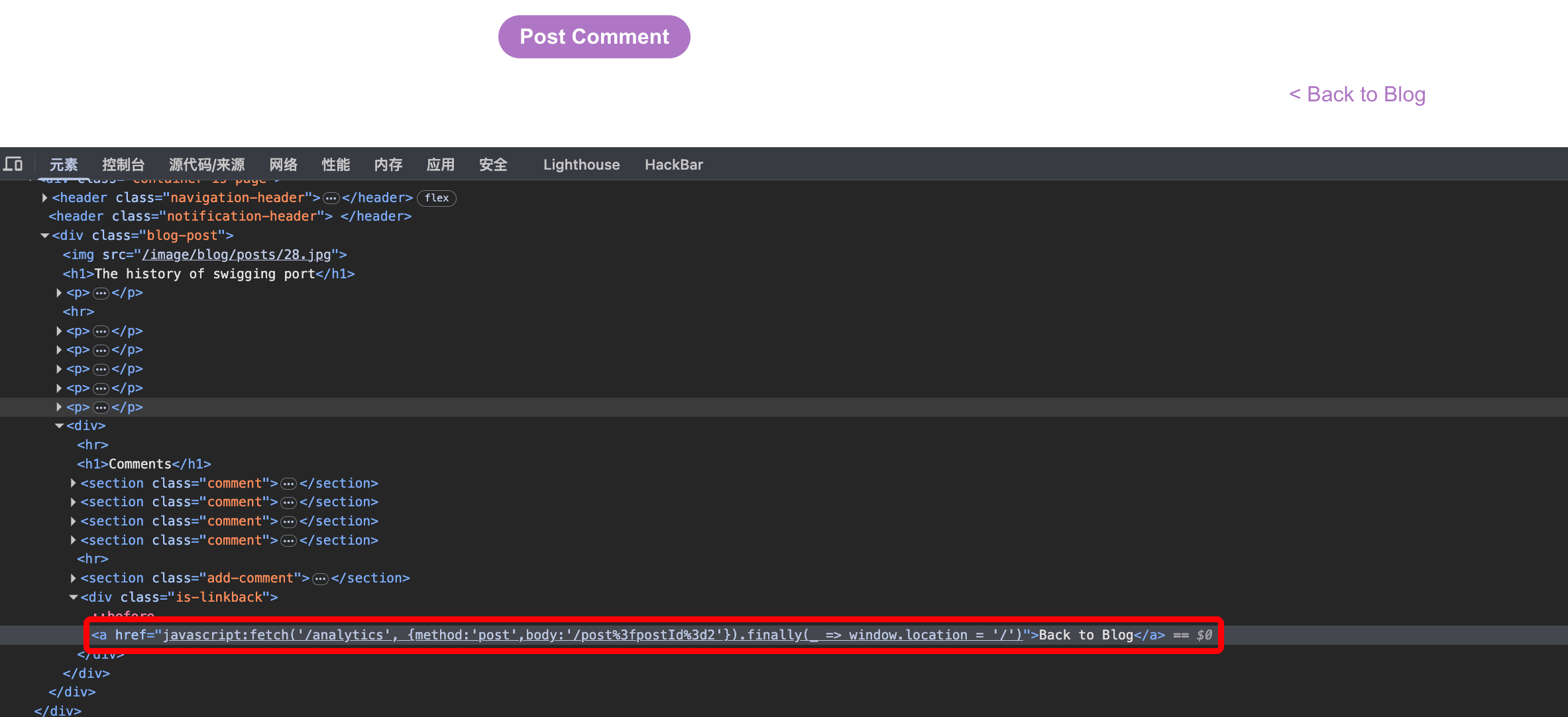 这道题考查点击触发 DOM 型 XSS,找到提交评论的页面,检查源码在返回按钮下方可发现一个 function 函数,由于它通过 $ 符号包裹,意味着它会自动运行函数。