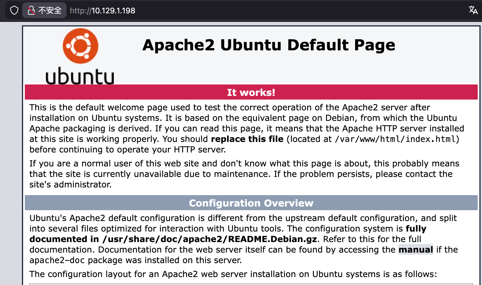 访问靶机 HTTP 80 服务,首页为 Apache 的默认页面。