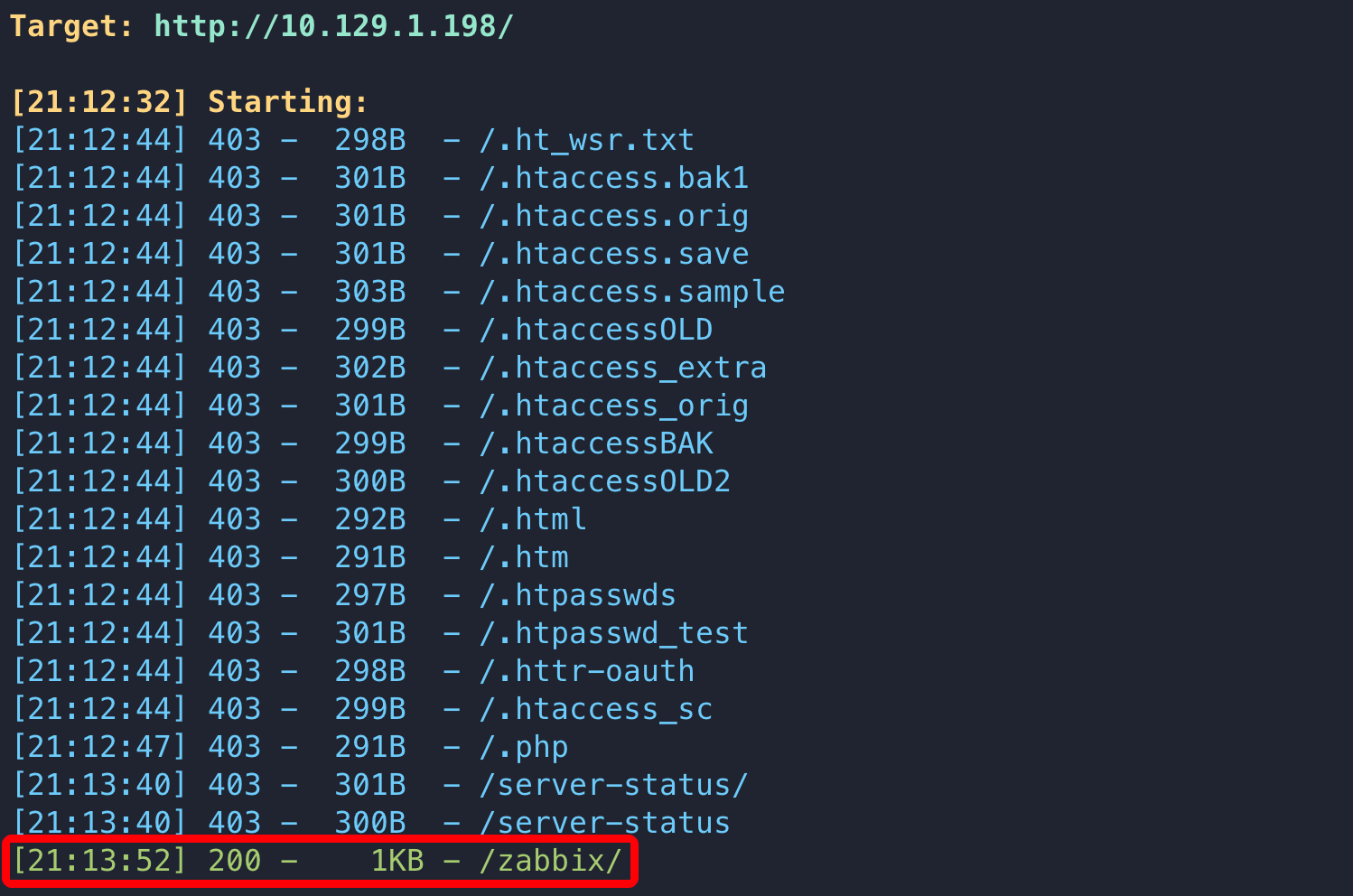 sudo nmap -p22,80,10050 -sCV 10.129.1.198 PORT STATE SERVICE VERSION 22/tcp open ssh OpenSSH 7.6p1 Ubuntu 4 (Ubuntu Linux; protocol 2.0) | ssh-hostkey: | 2048 59:20:a3:a0:98:f2:a7:14:1e:08:e0:9b:81:72:99:0e (RSA) | 256 aa:fe:25:f8:21:24:7c:fc:b5:4b:5f:05:24:69:4c:76 (ECDSA) |_ 256 89:28:37:e2:b6:cc:d5:80:38:1f:b2:6a:3a:c3:a1:84 (ED25519) 80/tcp open http Apache httpd 2.4.29 ((Ubuntu)) |_http-title: Apache2 Ubuntu Default Page: It works |_http-server-header: Apache/2.4.29 (Ubuntu) 10050/tcp open tcpwrapped Service Info: OS: Linux; CPE: cpe:/o:linux:linux_kernel