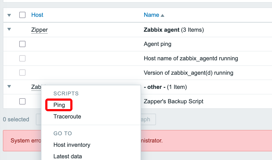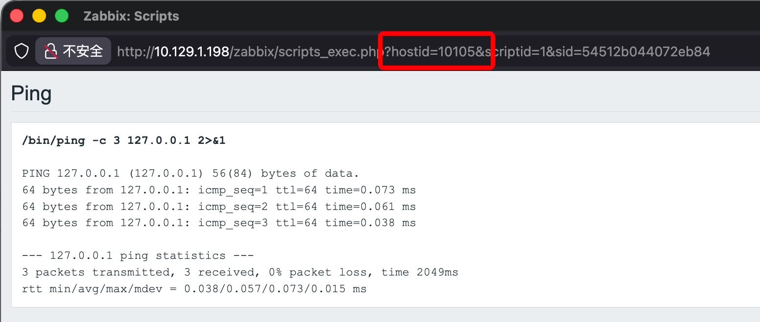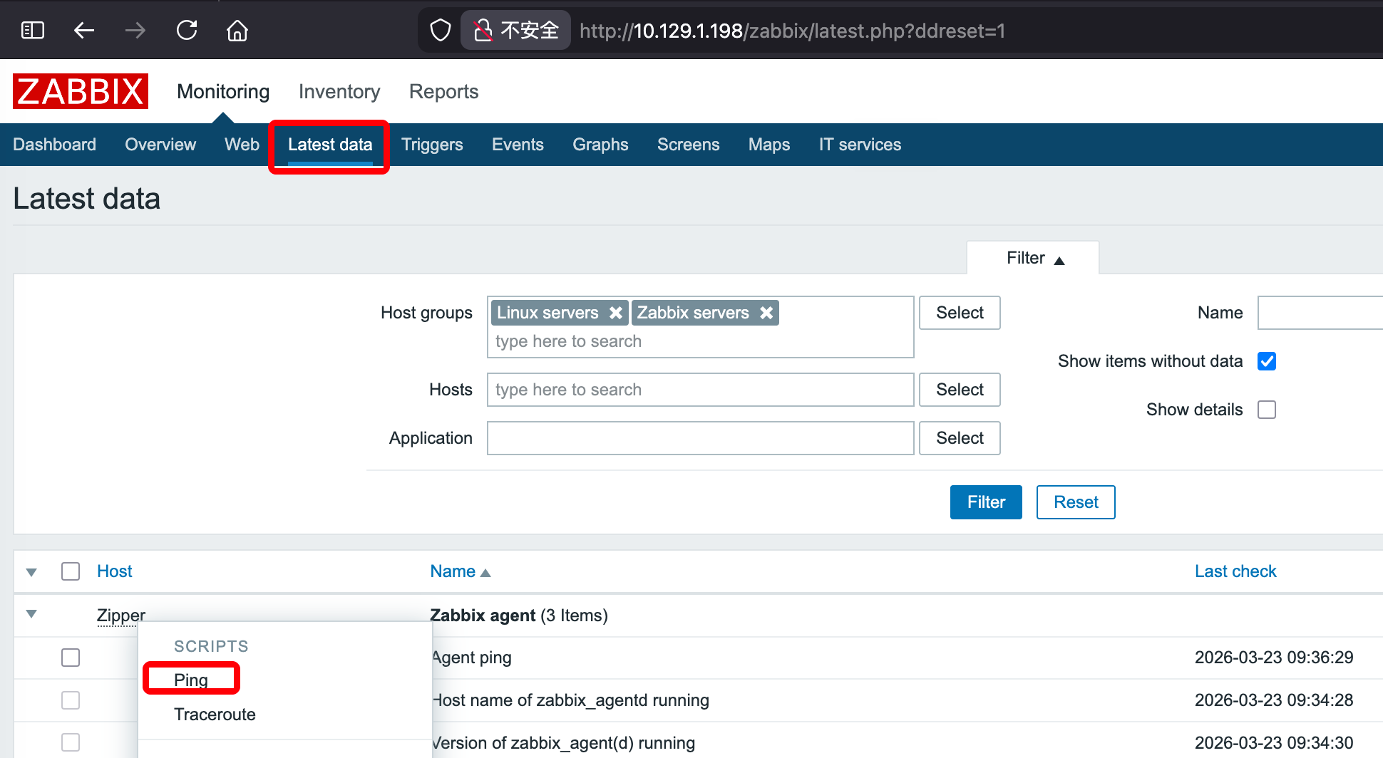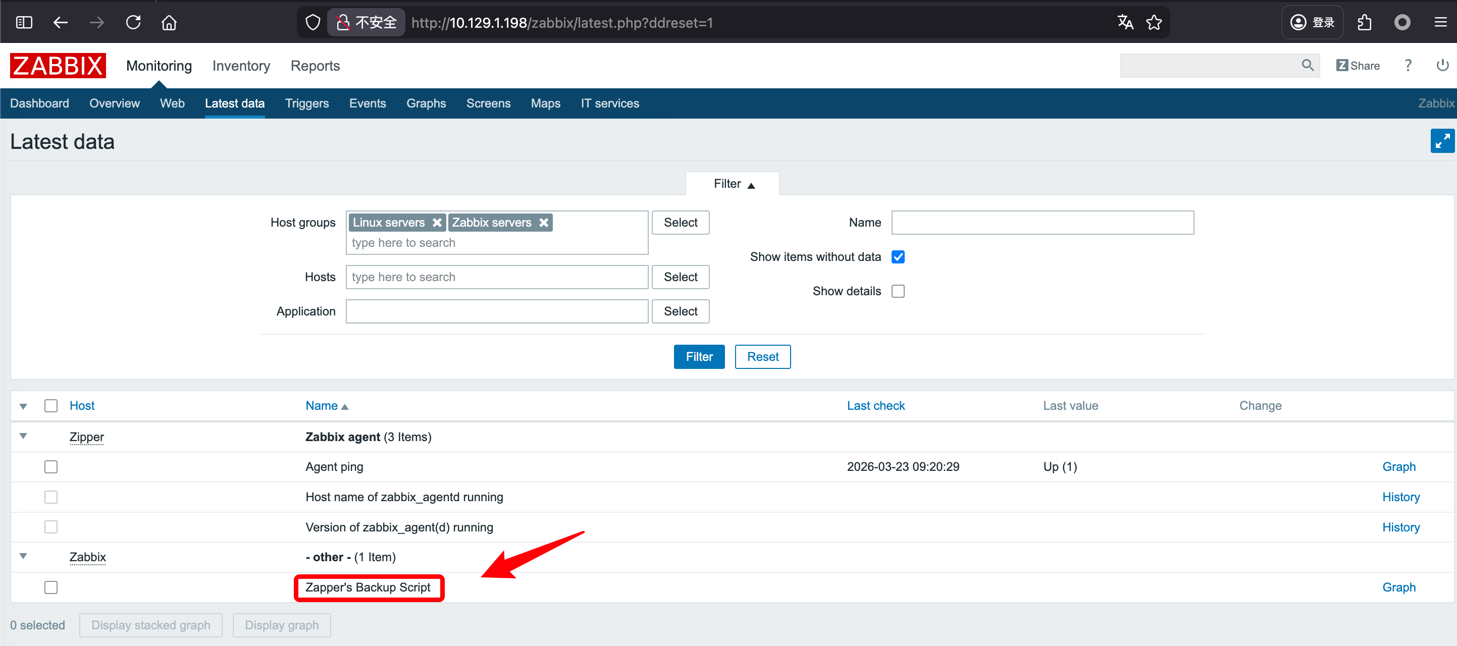 点击 latest data 发现系统共存在两个主机: Zipper、Zabbix,点击测试脚本从 URL 可得到 hostid。